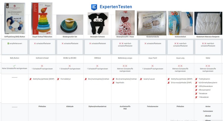 Zu den mit Schadstoffen belasteten Produkten zählen unter anderem die Motorikrassel von Hess oder auch das Schnorchelset der Firma Aqua Lung. In beiden Produkten wurde das kanzerogene Phthalat Diethylhexylphthalat (DEHP) nachgewiesen. Die Firma Hess fiel in Produkttests der Stiftung Warentest bereits im Jahre 2013 schon mit zwei Produkten auf, die in ihren Lacken ungewöhnlich hohe Organzinnverbindungen aufwiesen.