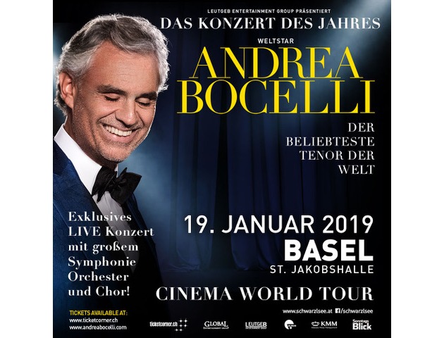 ANDREA BOCELLI´S exklusives Schweiz-Konzert im Rahmen seiner Welttournee am 19.1.2019 in Basel in der St. Jakobshalle, mit einer außergewöhnlichen LIVE-SHOW, großem Symphonieorchester, einem Chor der Extraklasse und zahlreichen, großartigen Gast-Künstlern, wird zu einem lebendigen Feuerwerk für alle Sinne.