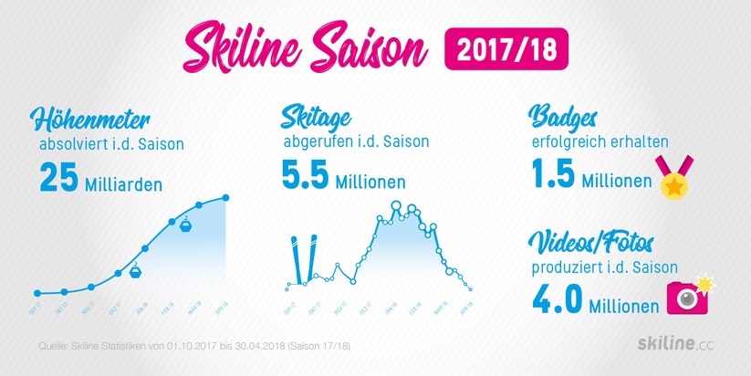 Nicht nur die kontinuierlich ansteigende Anzahl der Skiline User lässt die Konkurrenten von Alturos Destinations neidisch auf das Unternehmen blicken, sondern auch deren Fleiß beim Sammeln von zurückgelegten Höhenmetern - es waren unglaubliche 25 Milliarden, was ungefähr der 110-fachen durchschnittlichen Distanz zwischen der Erde und dem Mars entspricht. Mit 68 Millionen Liftfahrten und 4 Million aufgenommenen bzw. geschossenen Videos & Fotos gibt es weitere Kennzahlen, die zeigen wie aktiv die größte Wintersport-Community der Welt ist.