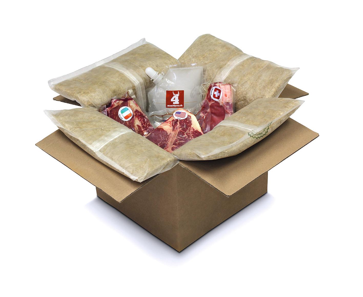 Clou der meat4you-Verpackung ist die kälteisolierende und feuchtigkeitsabsorbierende Schutzmatte aus naturreinem, kompostierbarem Hanf, welche das Fleisch im Versandkarton zuverlässig kühl hält. Hansruedi Kyburz, Geschäftsführer von meat4you.ch: «Wir haben lange nach einer Alternative für die umweltbelastende Styroporbox gesucht und vieles getestet, bis wir auf die Hanf-Lösung stiessen: Mit unserer neuen Verpackung lassen sich sämtliche Bestandteile natürlich abbauen, rezyklieren oder weiter nutzen.» So dient als Kälteelement beim Versand gefrorenes Leitungswasser, im weiter verwendbaren oder rezyklierbaren Eis-Beutel aus PET, welches sich nach dem Auftauen z.B. fürs Pflanzengiessen nutzen lässt.