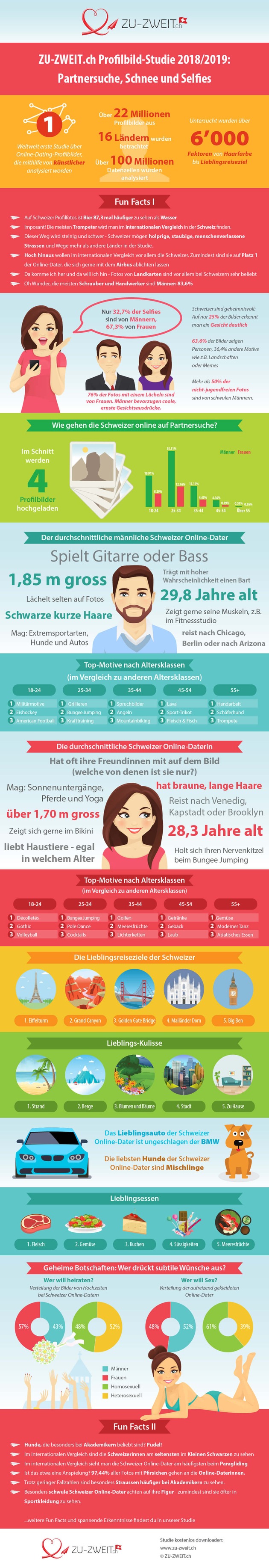 Welche Haarfarben sind zu sehen und welche Kleidung? Ist das Gesicht zu erkennen, lächeln die meisten Online-Dater oder schauen sie eher grimmig? Wer zeigt am meisten Haut? Was ist noch auf dem Bild zu sehen - Speisen, Getränke, Tiere oder gar eine Sehenswürdigkeit wie der Eiffelturm? Zeigen sich die Singles beim Sport, beim Feiern oder auch mal nur auf der Couch? Über 6'000 verschiedene Faktoren, darunter Erscheinungsmerkmale, Orte, Objekte aller Art und Grösse, Tiere, Anzahl der Personen, Gesichtsausdrücke und Farben wurden ausgewertet und in anschaulichen Diagrammen und Texten festgehalten. Aus den gewonnenen Erkenntnissen konnten die Experten von ZU-ZWEIT.ch auch praktische Tipps für die perfekte Profilbild-Auswahl ableiten, welche ebenfalls in der Studie enthalten sind.