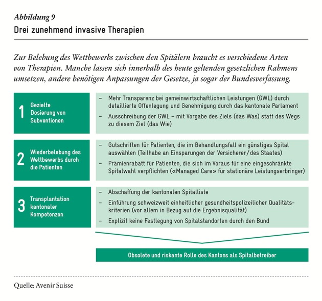 2. Aktiver Einbezug der Patienten: Patienten - also die Endkunden - sollen mitreden dürfen. Mit neuen Versicherungsmodellen, bei denen die Krankenkassen ihre Patienten vor Spitaleingriffen beraten, werden die Versicherten für Qualitäts- und Kostenunterschiede sensibilisiert. Wählen sie ein günstigeres, aber qualitativ gleichwertiges Angebot, werden sie für die resultierenden Kosteneinsparungen mit einer Gutschrift oder tieferen Prämien belohnt.
