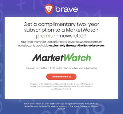 Im Rahmen der Vereinbarung wird Brave Zugriff auf Premium-Inhalte der Dow Jones Media Group für eine begrenzte Zahl von Nutzern bieten, die den Brave-Browser herunterladen, gemäß dem Prinzip "Wer zuerst kommt, mahlt zuerst". Das verfügbare Inhaltsset umfasst vollständigen Zugriff auf Barrons.com oder einen Premium MarketWatch-Newsletter, beides Titel aus der globalen Markenpalette der Dow Jones Media Group.