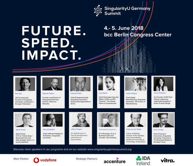 Auch in diesem Jahr wird der SU Germany Summit von starken Partnern begleitet. Neben Hauptpartner Vodafone unterstützen das Beratungsunternehmen Accenture, IDA Ireland und VITRA als strategische Partner die Konferenz. Stephan Balzer dazu: "Wir freuen uns sehr über das Engagement bei diesen wichtigen Zukunftsthemen. Unsere Partner teilen unsere Mission gleichermaßen und wissen um die strategische Relevanz und Bedeutung exponentieller Technologien und Künstlicher Intelligenz. Vielmehr noch: sie glauben an ihr Wachstumspotenzial."