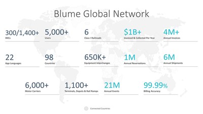 In seiner fast 25-jährigen Geschichte hat Blume Global (ehemals REZ-1) eine vertrauenswürdige Plattform für den intermodalen Bereich entwickelt, die mehr als 5.000 Nutzer, mehr als 300 intermodale Marketing-Unternehmen (IMCs) in 1.400 Büros und mehr als 6.000 Automobilspediteure zählt. Die Plattform verarbeitet für Kunden jährlich über 1 Milliarde US-Dollar an Transaktionen mit einer Abrechnungsgenauigkeit von 99,99 Prozent.