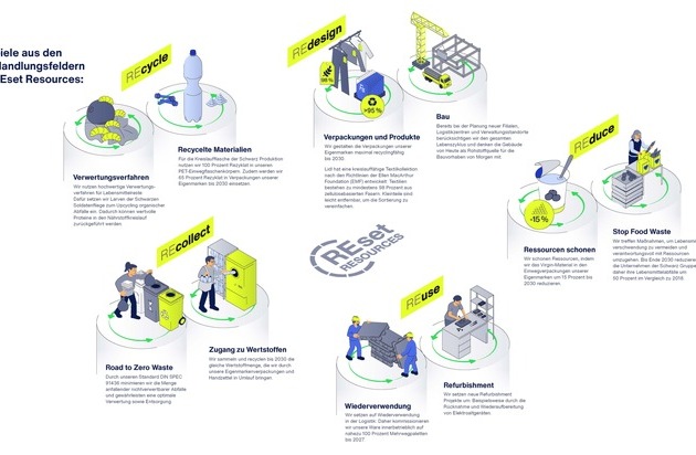 Kreislaufwirtschaft ist ein elementarer Teil des Nachhaltigkeitsengagements und somit auch des aktuellen, gemeinsam erstellten Nachhaltigkeitsberichts der Unternehmen der Schwarz Gruppe: So wurden im Geschäftsjahr 2024 vom gruppenweiten Gesamt-Abfall 88,6 Prozent recycelt, wiederverwendet, vergärt, kompostiert oder als Tierfutter eingesetzt. Gemeinsam setzen sich die Unternehmen der Schwarz Gruppe nun ambitionierte Ziele und entwickeln ihre Plastikstrategie REset Plastic zur ganzheitlichen Kreislaufwirtschaftsstrategie REset Resources weiter. Entlang der fünf Handlungsfelder REdesign, REduce, REuse, REcollect und REcycle prägt REset Resources den Ressourcenumgang innerhalb der Schwarz Gruppe über sämtliche Sparten und Länder hinweg. Ab sofort bekennen sich die Unternehmen der Schwarz Gruppe gemeinsam zu folgenden Leitsätzen und Verpackungszielen, die erstmalig sämtliche Verpackungsarten und -materialien einbeziehen: