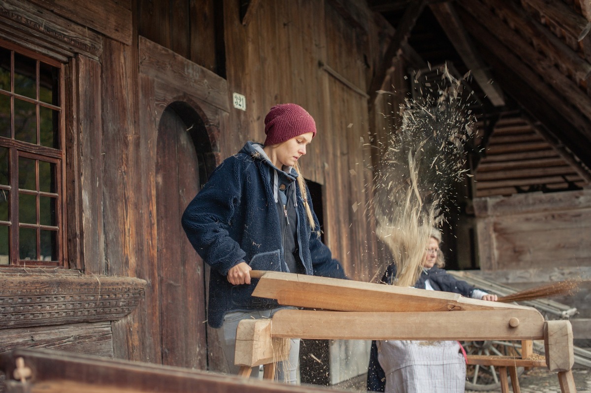 Autrefois, lorsqu’une famille d’agriculteurs avait une fille, elle semait immédiatement un grand champ de lin dans son jardin. En effet, une fois adulte, la jeune fille aura un jour besoin d’un trousseau pour pouvoir se marier. Les textiles en étaient une partie intégrante. Nappes et serviettes de table, housses de couette et taies d’oreiller, draps et tissus pour les vêtements: à partir des fibres de lin récoltées, les femmes tissaient un tissu qu’elles transformaient ensuite en différents articles. Au Ballenberg, nous défendons cette culture populaire et produisons nous-mêmes du lin: de la culture des graines de lin au tissage en passant par le traitement des fibres. Le week-end des 11 et 12 octobre 2025, nous célébrerons la traditionnelle fête de la «Brächete» (journées du lin). Pour l’occasion, cet artisanat ancien sera présenté à la maison paysanne de Madiswil BE (321). Le groupe folklorique du Trachtengruppe «Tanzä und Frehlich sy» de Sachseln et le quatuor d’accordéons schwyzois «Gugulüsch» de Lyssach assureront le divertissement. Pour les plus petits, un atelier «maquillage pour le visage» sera proposé à Balm.