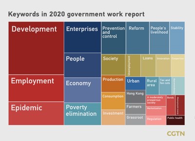 Die Häufigkeit der Wortwahl macht deutlich, dass die Entwicklung im diesjährigen Arbeitsbericht der Regierung neben der Stabilisierung der Beschäftigung und dem Kampf gegen die Epidemie von größter Bedeutung ist. Das Wort "Entwicklung" tauchte 76 Mal in der Rede von Premierminister Li auf, während das Wort "Beschäftigung" 39 Mal und "Epidemie" 34 Mal vorkamen.