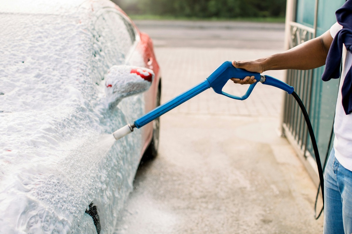 Mit Hochdruckreiniger oder Schaum (Snow Foam) werden grobe Verschmutzungen gelöst, um Kratzer bei der eigentlichen Handwäsche zu vermeiden.