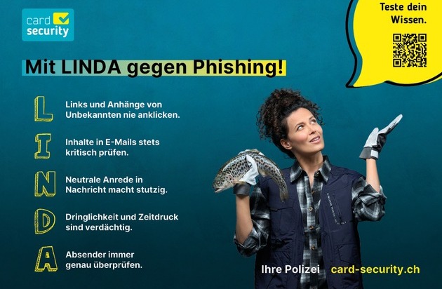 Heute startet die nationale Kampagne für mehr Kartensicherheit von Card Security in Zusammenarbeit mit der Polizei. "LINDA checkt's" lautet das Motto. Fischerin LINDA hilft Kartennutzer:innen dabei, sich vor Kartenbetrug zu schützen. Jeder Buchstabe von LINDAs Name steht für einen Merksatz, der hilft, Phishing zu verhindern. Kartenherausgeber und Banken in der ganzen Schweiz unterstützen die Kampagne und machen gemeinsam mit der Polizei auf das Thema Kartenbetrug aufmerksam: Denn Phishing-Attacken nehmen rasant zu.