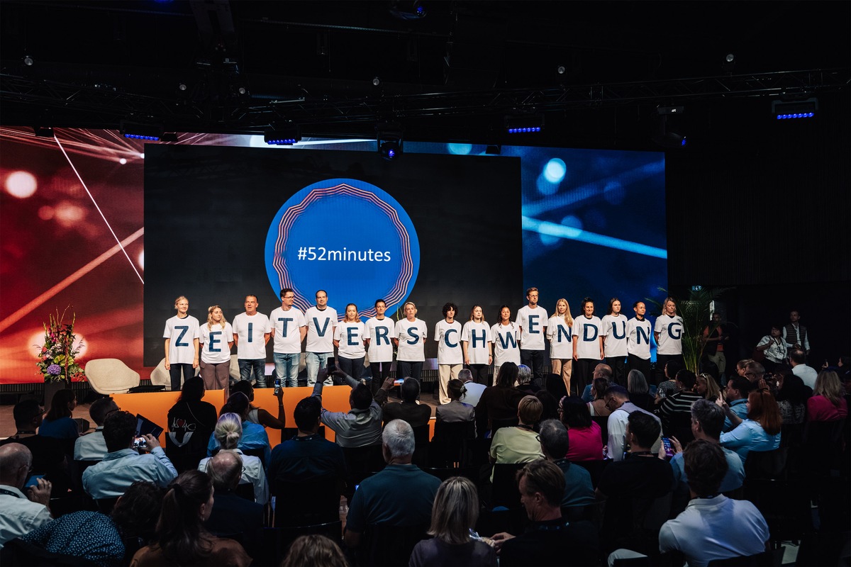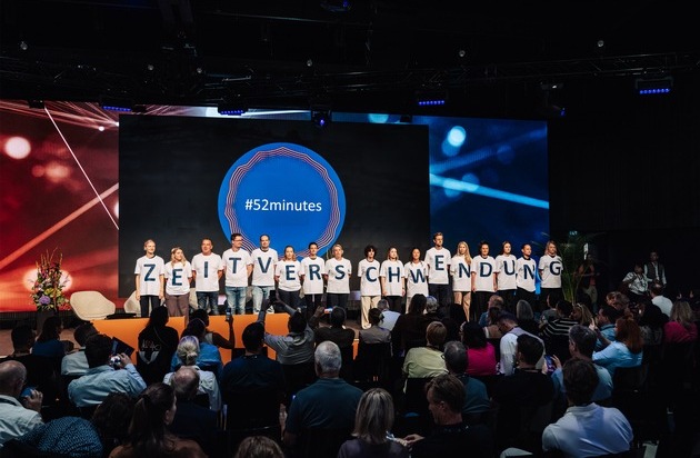 Die Aktion der myneva will auch außerhalb der Branche das Bewusstsein für die Zeitproblematik schärfen. Dazu kamen beim BIG BANK KI FESTIVAL vor Weißhaars Keynote 17 Menschen als "Störer" für 52 Sekunden auf die Bühne - sie trugen T-Shirts mit großen Buchstaben, die das Wort ZEITVERSCHWENDUNG ergaben.