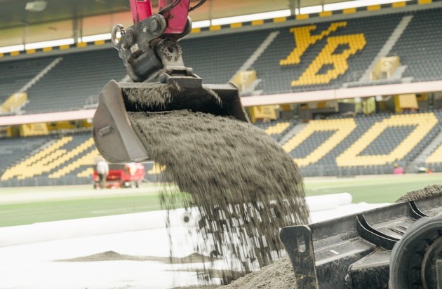 Zuerst musste der Kunstrasen geschützt werden. Dafür wurden 80 Tonnen Gummigranulat eingearbeitet, damit die 4 cm langen Kunstgrashalme ganz bedeckt sind und nicht knicken können. Als nächste Etappe wurde 16'000 Quadratmeter Vlies übers Granulat verlegt - so ist der Kunstrasen doppellagig abgedeckt. Als nächstes erfolgte eine Schicht mit 1'600 Tonnen Sand als Drainageschicht, dann eine 1'600 Tonnen Rasentragschicht aus einer Sandmischung.