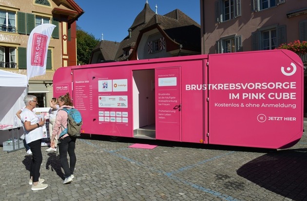 Sarnen, 18. September 2025 – Alle sechs Stunden stirbt in der Schweiz eine Frau an Brustkrebs. Früherkennung kann Leben retten. Um darüber aufzuklären, macht der PINK CUBE – ein leuchtend pinkes ärztliches Beratungszimmer – heute auf dem Dorfplatz in Sarnen Halt und informiert über Brustkrebs, bietet persönliche Beratung, kostenlose Tastuntersuchungen und vieles mehr.