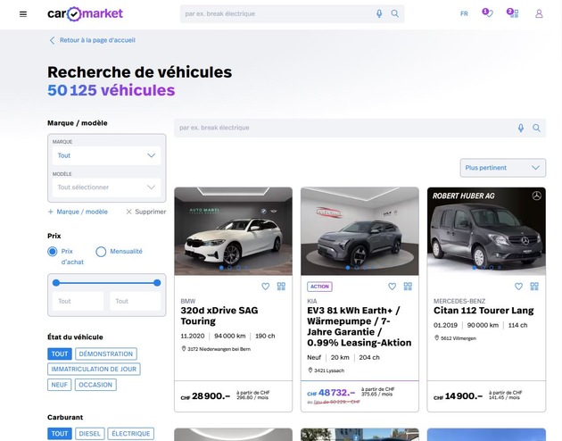 Que ce soit pour une voiture familiale, une citadine ou un SUV, les intéressés trouveront sur carmarket.ch des véhicules contrôlés de marques et de classes de prix variés. La plateforme est synonyme de transparence, de confiance et de convivialité et facilite ainsi l'achat de voiture comme jamais auparavant.