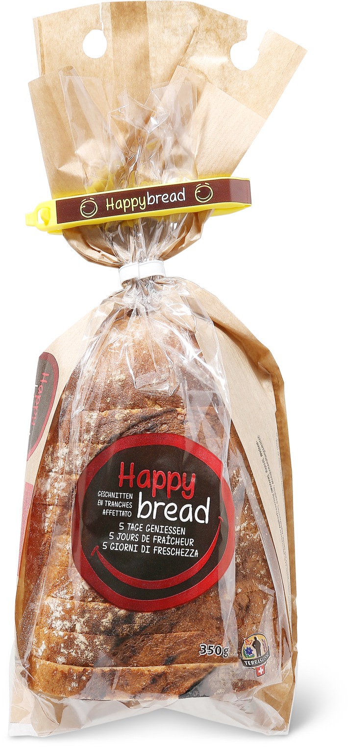 Happy bread est un pain frais composé principalement de farine TerraSuisse, de levain, d'eau et de sel. Il se distingue des autres pains conventionnels par le fait qu'il reste frais cinq jours durant, à partir de la date de vente, pour autant qu'il soit conservé dans le sachet spécialement conçu à cet effet. Ce pain est exempt de conservateurs et son goût n'a rien à envier aux autres pains suisses classiques. Il est prétranché et répond ainsi parfaitement aux besoins des personnes seules et des petits ménages.