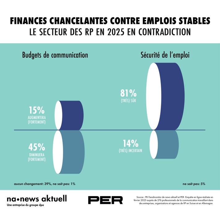 Le baromètre de l'humeur des relations publiques 2025 de news aktuell, filiale de la dpa, et de PER montre à nouveau une image partagée : alors que la sécurité de l'emploi reste élevée dans le secteur, les budgets sont de plus en plus sous pression. Huit professionnels de la communication sur dix interrogés continuent d'estimer que leur emploi est très sûr ou sûr. Parallèlement, près de la moitié d'entre eux s'attendent à une baisse des budgets de communication. Malgré ces incertitudes financières, l'évolution générale des affaires est majoritairement perçue comme satisfaisante, voire positive. 276 professionnels et cadres des RP de Suisse et d'Allemagne ont participé à l'enquête du PR-Trendmonitor.