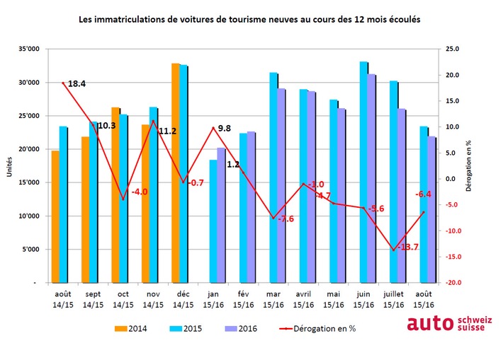 Au mois d'août, le marché automobile en Suisse et dans la principauté de Liechtenstein a évolué conformément aux attentes d'auto-suisse. 21 927 voitures de tourisme neuves correspondent certes à un recul de 1504 immatriculations ou de 6,4 % par rapport au même mois de l'année précédente. Néanmoins, il s'agit du quatrième meilleur résultat d'août des 15 dernières années. Depuis le début de l'année, 206 038 voitures ont été immatriculées pour la première fois dans les deux pays, ce qui revient à un recul de 4,4 % ou de 9419 unités. Au vu du caractère exceptionnel de l'année passée avec un franc fort et d'importantes réductions des prix, ce léger fléchissement de la demande n'est guère surprenant.