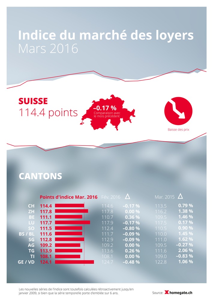 Communiqué de presseIndice du marché des loyers homegate.ch: léger recul des loyers proposés en mars 20162016-04-07T09:00:02Zurich (ots) - Au mois de mars 2016, les loyers proposés en Suisse ont baissé de 0,17 pour cent. L'indice Suisse se situe à 114.4 points. Par rapport au même mois de l'année précédente, les loyers ont augmenté de 0,79 pour cent. Dans les cantons de Genève et Vaud, les loyers proposés ont chuté d'environ 0,48 pour cent. Ce résultat a été mis en évidence par l'indice homegate.ch du marché des loyers, qui est établi par le portail immobilier homegate.ch en collaboration avec la Banque Cantonale de Zurich (BCZ). Il mesure les variations mensuelles des loyers après correction des facteurs qualificatifs pour les appartements mis ou remis en location sur la base des offres actuelles du marché. Evolution dans les différents cantons En mars 2016, l'indice du marché des loyers Suisse a baissé d'environ 0,17 pour cent. Par rapport au même mois de l'année précédente, il en résulte une augmentation de 0,79 pour cent. L'indice du marché des loyers Suisse se monte à 114.4 points. Dans le canton de Zurich, les loyers restent inchangés à un niveau d'indice de 117.8 points. En comparaison avec le mois précédent, les loyers ont augmenté de 1,38 pour cent. Dans les cantons d'Argovie et du Tessin aussi, les loyers restent inchangés au même niveau d'indice que le mois précédent. Les cantons de Lucerne (-0,17 pour cent), Soleure (-0,80 pour cent), Bâle (-0,09 pour cent), St-Gall (-0,09 pour cent), Genève et Vaud (-0,48 pour cent) affichent un léger recul des loyers. En mars 2016, les loyers augmentent uniquement dans deux cantons, à savoir Berne (0,36 pour cent) et Thurgovie (0,26 pour cent). Contact: Homegate SA Permalink: