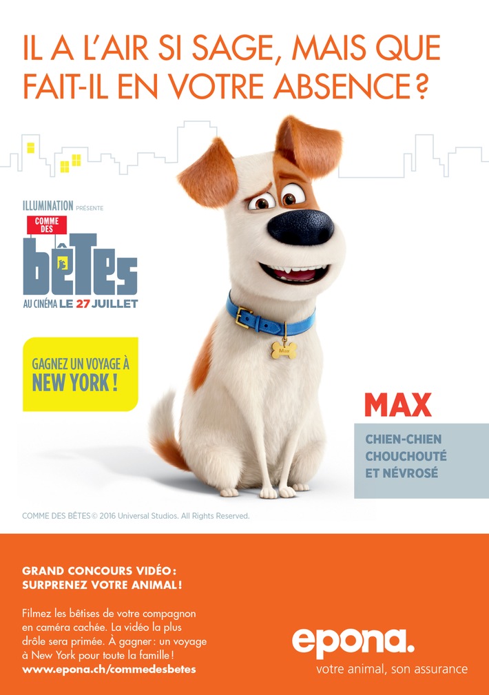 Communiqué de presseEpona déroule le tapis rouge aux animaux du prochain film d'animation d'Universal2016-06-09T15:29:53Lausanne (ots) - A l'occasion de la sortie du film « The Secret life of Pets », Epona, le leader suisse de l'assurance animalière, collabore avec les prestigieux Studios d'Universal et lance une campagne de communication digitale novatrice. Avec cette opération, Epona confirme son développement stratégique et numérique, avec une présence accrue sur le web et les réseaux sociaux, et bientôt de nouveaux services, comme la conclusion de produits d'assurance en ligne. A propos d'EPONA Née en 1901 dans le but de protéger les chevaux, Epona est devenue au fil des ans l'assurance de tous les animaux. Aujourd'hui, elle est le leader suisse dans son domaine et propose à ses clients des solutions optimales pour assurer leurs animaux en cas de maladie, d'accident, etc. Pendant plus de 115 ans, Epona a montré à quel point le bien-être des animaux et la sérénité de leurs propriétaires lui tiennent à coeur. Contact: Epona, Olivier Grangier, olivier.grangier@epona.ch, 021 654 31 25 Permalink: