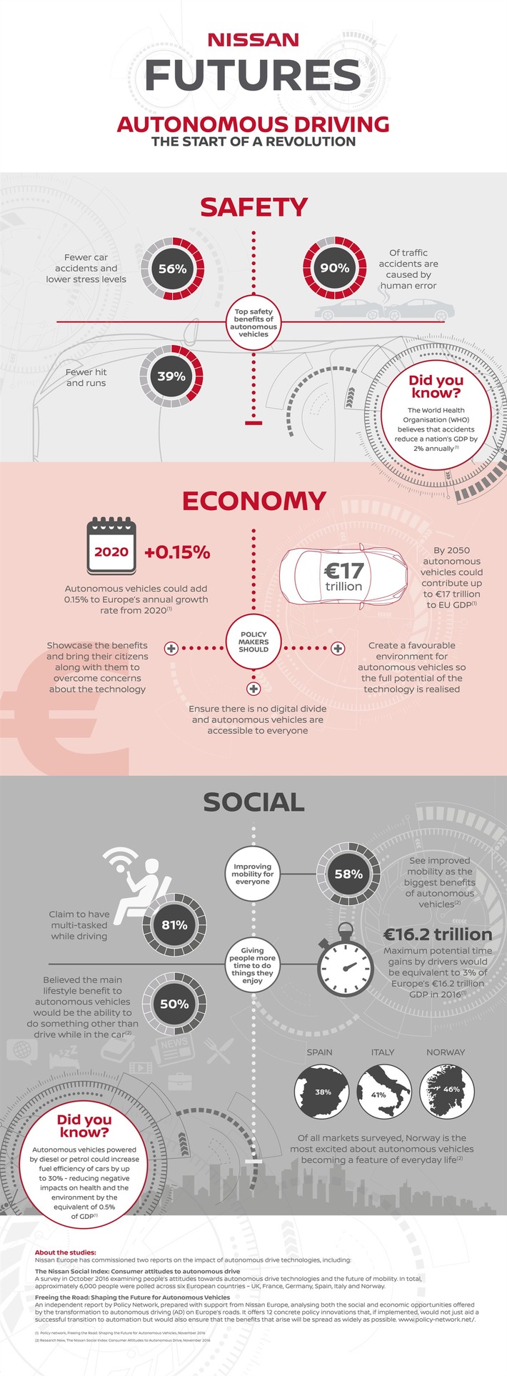 Nissan dévoile l'une des études les plus complètes révélant pour la première fois le véritable impact social et financier des véhicules autonomes sur les routes d'Europe. Freeing the Road : Shaping the future for autonomous vehicles est un rapport indépendant réalisé par le groupe de réflexion Policy Network pour le compte de Nissan Europe. Son objectif était d'analyser les opportunités socio-économiques qu'offrent les technologies de conduite autonome.