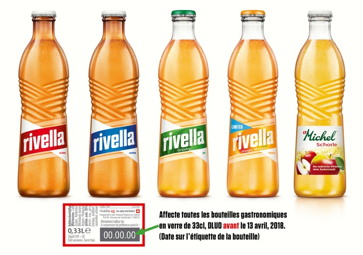 Communiqué de presseRivella rappelle ses bouteilles en verre, le PET et les boîtes alu ne sont pas concernés / Rappel de produit après la découverte de résidus de verre2017-05-22T12:11:12Rothrist (ots) - Rivella SA est amenée à rappeler une partie de ses produits conditionnés dans des bouteilles en verre de 33 cl. Ceci après qu'un consommateur ait annoncé avoir découvert des résidus de verre dans un produit Rivella. Des examens lancés dans la minute ont permis de déceler d'autres cas de résidus de verre. Les analyses mises en oeuvre ont également permis de constater que les bouteilles en verre concernées provenaient toutes de la même installation de remplissage, laquelle avait été mise à l'arrêt et remplacée par une autre machine ce printemps déjà. Rivella ne fait aucun compromis eu égard à la sécurité de ses produits et rappelle donc toutes les bouteilles en verre de 33 cl, remplies par l'installation désormais remplacée. Les bouteilles en PET, boîtes alu ou les bouteilles en verre de tailles différentes ne sont pas concernées et peuvent être consommées en toute sécurité. Rivella regrette cette anomalie et présente ses excuses pour les désagréments causés. Il y a quelques jours, Rivella a reçu un message annonçant qu'un client d'un restaurant avait découvert des résidus de verre dans une bouteille en verre de Rivella. Rivella a pris le cas très au sérieux et lancé dans la foulée une analyse interne. Il est apparu que la bouteille en verre concernée avait été remplie par une machine ayant été arrêtée et remplacée par une nouvelle installation au printemps, conformément au calendrier de maintenance. Un échantillonnage méticuleux de produits issus de cette ancienne machine a permis de constater que des résidus de verre épars pouvaient se trouver dans les bouteilles. « Chez Rivella, la sécurité de nos produits est une priorité absolue. Nous avons donc décidé de rappeler immédiatement les bouteilles en verre de 33 cl concernées, qui ont été remplies par l'ancienne installation et se trouvent encore en circulation », explique Erland Brügger, directeur de Rivella SA. Les produits concernés sont exclusivement des bouteilles en verre de 33 cl des lignes de produits Rivella Rouge, Bleu, Thé vert et Mangue, ainsi que les Michel Schorle vendus dans le secteur de la gastronomie. Le rappel touche toutes les bouteilles en verre de 33 cl avec délai de péremption avant le 13 avril 2018 (date imprimée sur l'étiquette au dos de la bouteille). La grande majorité des produits Rivella n'est pas concernée Les produits suivants de la maison Rivella ne sont pas concernés et peuvent être consommés sans autre précaution : - Rivella : toutes les bouteilles en PET et boîtes en alu - Michel : tous les jus de fruits, nectars et boissons fruitées LIQIT - Passaia : tous les produits Les clients et les autorités ont été informés Les autorités compétentes en Suisse et à l'étranger ont été informées. Rivella a également contacté ses fournisseurs de boissons et clients, les priant de soutenir l'action de rappel. Pour sa part, Rivella traitera le rappel sans tracasseries administratives et présente ses excuses pour les désagréments causés. Rivella a par ailleurs ouvert une hotline pour ses clientes et clients intéressés au numéro 0800 80 80 92 (joignable tous les jours de la semaine, de 7 heures à 18 heures). Photos de presse sous www.pprmediarelations.ch/image/rivella Interlocutrice pour les médias : Monika Christener, responsable Communication d'entreprise Rivella SA Permalink: