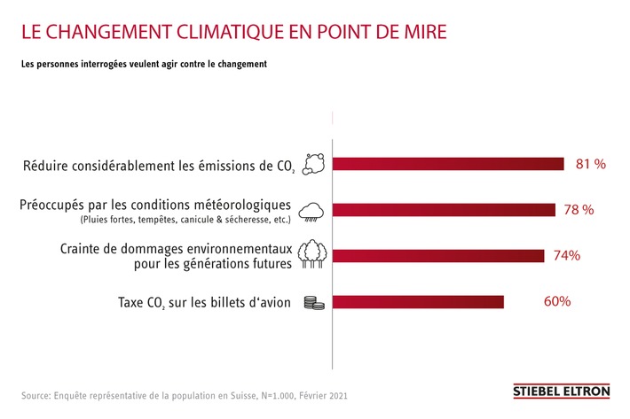 Communiqué de presseEnquête: 78% des Suisses sont préoccupés par les phénomènes météorologiques extrêmes2021-08-10T08:16:34Lupfig (ots) - Les trois quarts des Suisses sont préoccupés par le fait que les événements météorologiques extrêmes se multiplient en raison du changement climatique. 74 pour cent craignent qu’il soit déjà trop tard pour éviter que les générations futures ne subissent des dommages environnementaux. Tels sont les résultats issus du «moniteur de tendance énergie Suisse 2021» Un institut d’études de marché a interrogé 1000 consommateurs à cette fin. La grande majorité de la population est prête à modifier son propre comportement afin de protéger le climat: 81 pour cent souhaitent limiter volontairement leurs propres émissions de CO2 dans la vie quotidienne. Près de 60 % sont prêts à payer une taxe sur le CO2 sur un billet d’avion jusqu’à un maximum de 120 francs. Plus d’un sur deux renoncerait aux voyages en avion en Europe. Les Suisses se plaignent des obstacles à la protection du climat La réduction des combustibles fossiles utilisés pour la production d’eau chaude et le chauffage dans les foyers permet d’économiser beaucoup plus de gaz à effet de serre que la limitation des déplacements. 77 pour cent de la population a admis que la protection du climat est importante en matière de chauffage. Toutefois, selon les consommateurs, la mise en œuvre concrète se heurte à de nombreux obstacles: 73 pour cent se plaignent du déficit d’information sur le chauffage respectueux de l’environnement. 62 pour cent ne savent pas comment obtenir un soutien financier pour passer à une technologie de chauffage respectueuse du climat. Subventions et tarifs écologiques «Pour les rénovations ou les nouvelles constructions, il existe en Suisse de nombreux programmes de subventions de la Confédération, des cantons et des communes qui apportent un soutien financier pour passer des brûleurs à fioul ou à gaz à des systèmes de chauffage par pompe à chaleur respectueux du climat. En outre, les fournisseurs d’énergie se sont préparés au tournant énergétique avec des subventions et des tarifs d’électricité réduits», explique Patrick Drack, Directeur de Stiebel Eltron Suisse. «Nos experts en énergie proposent aux consommateurs un service permettant d’identifier toutes les subventions en Suisse en fonction de la localisation du bâtiment. À l’aide d’exemples concrets, nous montrons comment il est possible de mettre fin au chauffage au fioul et au gaz et de passer à des systèmes de chauffage respectueux du climat.» Vous pouvez découvrir comment la Suisse rend possible une technologie de chauffage écologique pour les particuliers et les entreprises sous: http://www.stiebel-eltron.ch/subventions À propos de Stiebel Eltron En qualité d’entreprise familiale animée par l’innovation, STIEBEL ELTRON symbolise les solutions novatrices dans les domaines eau chaude sanitaire, chauffage, ventilation et refroidissement. À cet égard, le fournisseur d’installations et de systèmes techniques des bâtiments suit une orientation claire vers des installations techniques écologiques, efficaces et confortables. Avec un effectif de 4000 collaborateurs dans le monde, le groupe ayant son siège à Holzminden/DE mise résolument sur son propre savoir-faire, de la conception à la fabrication des produits. La filiale suisse Stiebel Eltron AG fait partie des distributeurs leaders de produits dans le secteur des énergies renouvelables. Elle a été fondée en 1978 et constitue depuis de nombreuses années l’une des filiales les plus prospères du groupe. Contact: Référence STIEBEL ELTRON Permalink: