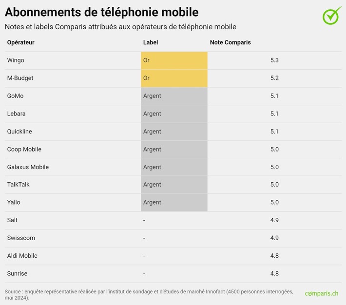 En 2024, Wingo, filiale de Swisscom, a obtenu la meilleure note pour les abonnements de téléphonie mobile et décroche ainsi le label Or (note : 5,3). Arrive ensuite M-Budget (note : 5,2), qui remporte également le label Or. GoMo, Lebara et Quickline se classent à la 3e place avec la note de 5,1, synonyme de label Argent.