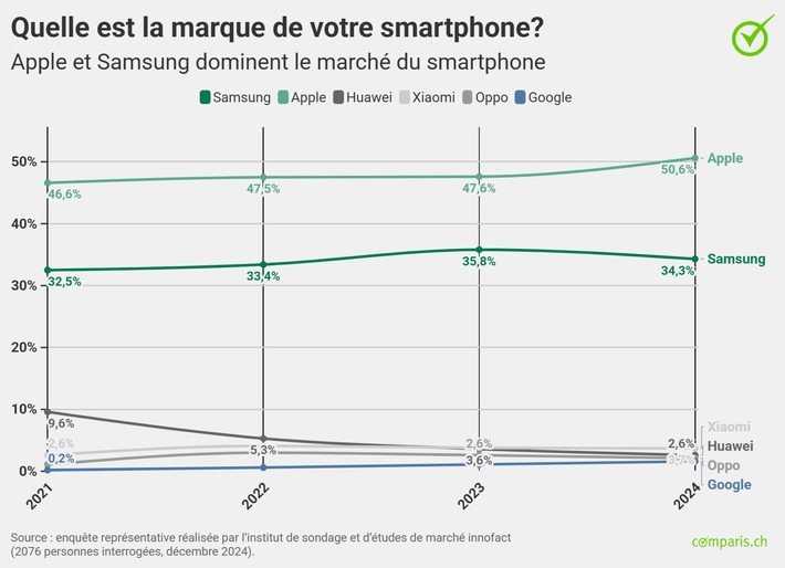 Communiqué de presseCommuniqué de presse: Apple a réussi à augmenter considérablement sa part de marché en Suisse en 20242025-02-11T00:30:40Communiqué de presse Étude Comparis sur les smartphones 2024 Apple a réussi à augmenter considérablement sa part de marché en Suisse en 2024 Le marché suisse des smartphones connaît un net changement : Apple a continué à gagner des parts de marché et a presque rattrapé Android. L’année dernière, plus que 50,3 % des adultes en Suisse utilisaient un smartphone Android. C’est ce qu’indique une enquête représentative de comparis.ch. « Apple a pu augmenter sa part de marché dans le monde entier depuis 2020. Cela est dû en premier lieu à la forte fidélité de ses clients », déclare Jean-Claude Frick, expert Numérique chez Comparis. Dans le même temps, le désir d’acheter de nouveaux appareils diminue : de plus en plus de personnes interrogées utilisent leur appareil plus longtemps. Zurich, le 11 février 2025 – Sur le marché suisse des smartphones, un net changement a pu être observé en 2024 dans le domaine des systèmes d’exploitation : l’année dernière, plus que 50,3 % des personnes interrogées utilisaient un smartphone Android. Cette part est en baisse par rapport aux années précédentes. Dans le même temps, l’utilisation des iPhones Apple a augmenté de manière significative : 49,4 % des personnes interrogées ont utilisé un iPhone en 2024, contre 45,6 % en 2021 et 44,3 % en 2020. C’est ce qui ressort d’une enquête représentative de comparis.ch, le comparateur en ligne. « Apple a pu augmenter sa part de marché dans le monde entier depuis 2020. Cela est dû en premier lieu à la forte fidélité de ses clients. L’introduction de la 5G et de l’USB-C a également rendu la plateforme plus compétitive. Chez les jeunes, l’attrait de la marque culte Apple reste intact », déclare Jean-Claude Frick, expert Numérique chez Comparis. Apple domine le marché des appareils En ce qui concerne les appareils, Apple domine également clairement le marché suisse en 2024 (50,6 %). Samsung a suivi avec 34,3 %, mais n’a pas montré d’augmentation significative par rapport à Apple. Huawei, le plus grand perdant, a chuté au fil des ans de 10,9 % en 2020 à 2,6 % en 2024. « L’interdiction d’utiliser la technologie occidentale a coupé l’herbe sous le pied de Huawei et a empêché les Chinois de rivaliser avec Samsung dans le camp Android. L’absence des principaux services Google entraîne des difficultés à utiliser des applications connues sur les smartphones de Huawei et rend les appareils peu attrayants depuis des années », explique Jean-Claude Frick. Choix du smartphone : l’appareil actuel influence considérablement la décision d’achat Selon l’enquête, l’utilisation antérieure joue un rôle important dans le choix du prochain smartphone. Parmi les utilisatrices et utilisateurs actuels d’Apple, 91,8 % souhaitaient acheter à nouveau un iPhone. Parmi les utilisatrices et utilisateurs d’Android, 89,6 % prévoyaient également de choisir à nouveau un appareil Android. « Apple a montré l’exemple, Samsung et Google suivent : de plus en plus de fabricants misent sur un écosystème fermé d’accessoires, ce qui rend difficile pour les clients de changer de fabricant de téléphones portables », explique l’expert Comparis. Smartphones utilisés plus longtemps : l’envie d’acheter un nouvel appareil diminue La volonté d’acheter un smartphone dans les 12 prochains mois reste faible. En 2024, seuls 38,4 % prévoyaient un achat, contre 46,9 % en 2020. À l’inverse, 61,6 % des personnes interrogées ne souhaitaient pas acheter de nouvel appareil en 2024. Il s’agit là d’une augmentation significative par rapport aux 53,1 % en 2020. Les hommes (43,4 %) et le groupe d’âge des 36-55 ans (43,7 %) ont montré une plus grande propension à acheter que les femmes (33,5 %) et les personnes âgées de plus de 56 ans (30,3 %). La hausse des prix et les promesses de mise à jour plus longues des fabricants ont pour effet que les smartphones sont de plus en plus utilisés sur une longue durée. Alors qu’en 2020, 22 % utilisaient encore leur appareil pendant au moins 3 ans, ils étaient déjà 31,3 % en 2024. Dans le même temps, la volonté d’acheter a diminué : seuls 38,4 % prévoyaient d’acheter un nouveau smartphone dans un délai d’un an. Ce sont surtout les coûts élevés des modèles haut de gamme et l’attractivité croissante des appareils d’occasion qui ont permis à de nombreux utilisatrices et utilisateurs de retarder leur décision d’achat. Augmentation des appareils d’occasion sur le marché des smartphones Les nouveaux appareils continuent de dominer le marché. Cependant, le nombre d’appareils d’occasion a considérablement augmenté par rapport à 2020. En 2024, 10,2 % des personnes interrogées ont déclaré avoir acheté un appareil d’occasion. En 2020, cette part n’était que de 8,3 %. Selon Jean-Claude Frick, les promesses de mise à jour des fabricants jouent un rôle important lors de l’achat d’appareils d’occasion : « Les prix des modèles phares de Samsung et d’Apple s’élèvent depuis quelques années à plus de 1000 francs. Dans le même temps, les deux fabricants promettent plusieurs années de mises à jour logicielles, ce qui rend l’achat d’un appareil d’occasion plus attrayant. Des batteries plus grandes donnent également la certitude de pouvoir utiliser sans problème un appareil de deux ans pendant encore quelques années. » La réparabilité et la disponibilité des pièces détachées perdent de leur importance Bien que les Suissesses et les Suisses veuillent utiliser leurs appareils plus longtemps et qu’ils aient tendance à payer plus cher pour un nouvel appareil ou même à acheter un appareil d’occasion, la réparabilité du téléphone portable a considérablement perdu de son i