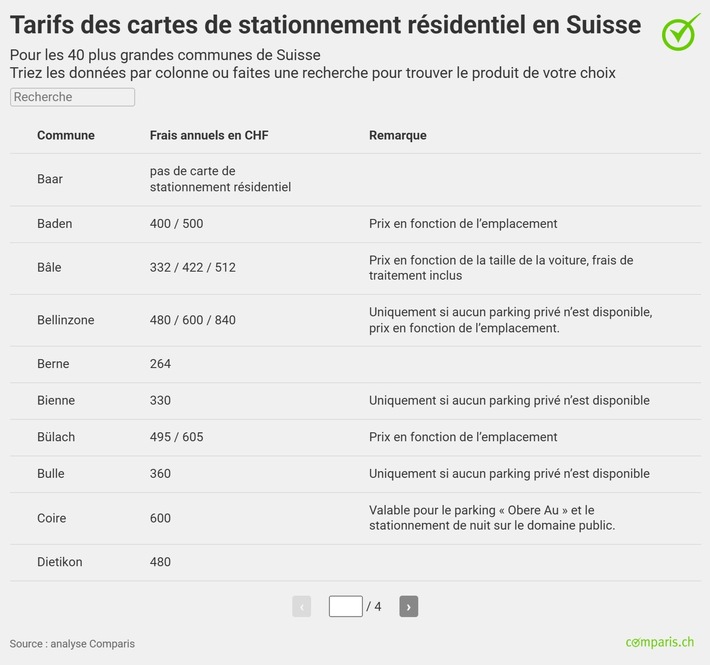 Communiqué de presseCommuniqué de presse: De 20 francs à plus de 1000 francs : grandes différences de prix pour les cartes de stationnement résidentiel2025-02-18T00:30:28Communiqué de presse Analyse Comparis sur les cartes de stationnement permanent dans les villes suisses De 20 francs à plus de 1000 francs : grandes différences de prix pour les cartes de stationnement résidentiel En Suisse, les différences de prix des cartes de stationnement permanent sont énormes : les habitants de La Chaux-de-Fonds stationnent pendant un an pour 20 francs, alors qu’à Wetzikon, la carte de stationnement annuelle coûte 960 francs. C’est ce qu’indique une étude comparative réalisée par Comparis portant sur les cartes de stationnement permanent dans les 40 plus grandes villes de Suisse. « Comme dans de nombreux autres domaines, la Suisse est un patchwork également en ce qui concerne les cartes de stationnement. Cela se reflète à la fois dans les tarifs extrêmement différents et dans les diverses directives pour l’octroi de cartes de stationnement résidentiel », explique Adi Kolecic, expert Mobilité Comparis. En outre, une tendance au renchérissement des cartes de stationnement est perceptible, ce qui pèse encore plus sur le budget de nombreux propriétaires de voitures dans les villes. Zurich, le 18 février 2025 – Une analyse récente du comparateur en ligne comparis.ch révèle d’énormes différences de prix des cartes de stationnement résidentiel dans les 40 plus grandes communes de Suisse. Alors qu’une carte de stationnement annuelle à La Chaux-de-Fonds ne coûte que 20 francs, Wetzikon demande 960 francs. « Comme dans de nombreux autres domaines, la Suisse est un patchwork également en ce qui concerne les cartes de stationnement. Cela se reflète à la fois dans les tarifs extrêmement différents et dans les diverses directives pour l’octroi de cartes de stationnement résidentiel », observe Adi Kolecic, expert Mobilité chez Comparis. Parking bon marché dans les villes de Suisse romande Les régions situées à l’ouest sont plus généreuses que les villes de l’est de la Suisse. Ainsi, une carte de stationnement permanent coûte 200 francs dans toutes les communes genevoises et seulement 110 francs à Neuchâtel. Les résidents de La Chaux-de-Fonds reçoivent même une carte de stationnement annuelle gratuite. Ils doivent seulement payer des frais de traitement de 20 francs. Les villes bernoises de Thoune (220 francs) et de Berne (264 francs) sont également remarquablement bon marché. « Les cartes de stationnement permanent les moins chères se trouvent souvent dans les villes où les impôts sont élevées, c’est-à-dire plutôt en Suisse romande », déclare l’expert Comparis. Par exemple, Genève a le taux d’imposition sur le revenu le plus élevé avec plus de 43 %, alors qu’à Zoug, il est nettement plus bas avec à peine 23 %. Frais de stationnement indépendamment de la politique environnementale Il n’est toutefois pas possible d’établir un lien direct entre la tarification régionale et l’orientation politique des villes. Alors que les villes dominées par la gauche et les Verts suivent souvent une politique environnementale plus stricte, il n’y a pas de lien évident avec les frais de cartes de stationnement permanent. Ainsi, des villes comme La Chaux-de-Fonds (64 % de sièges de gauche-Verts au parlement communal), Genève (55 %) et Berne (55 %) sont parmi les plus avantageuses. Dans le même temps, les majorités bourgeoises prédominent dans les villes où les frais de stationnement sont relativement élevés. C’est notamment le cas de Wetzikon, où la part gauche-Verts n’est que de 36 %, de Wil SG (33 %) ou de Zoug (31 %). « Les prix des cartes de stationnement permanent dépendent moins de la couleur politique d’une ville que des conditions économiques », explique l’expert Mobilité Adi Kolecic. « On trouve souvent des frais élevés dans les communes à forte capacité financière. » Les habitants doivent payer de plus en plus cher leurs cartes de stationnement Les cartes de stationnement permanent encore bon marché à Berne ne le resteront pas longtemps. En 2023, les électrices et électeurs ont accepté une augmentation de 264 à 492 francs. Toutefois, la mise en œuvre est retardée en raison de plaintes en cours. À Bâle, les prix ont déjà fortement augmenté : depuis 2025, une carte de stationnement résidentiel y coûte jusqu’à 512 francs au lieu de 284 francs précédemment. Une augmentation significative des frais est prévue à Zurich. En outre, des conditions plus strictes s’appliqueront. Cependant, un référendum a été lancé contre la décision. Un votation populaire aura lieu à l'automne 2025. Ces développements montrent que les cartes de stationnement permanent sont de plus en plus chères dans de nombreuses villes. Cela est particulièrement pénalisant pour les automobilistes qui ne disposent pas de leur propre espace de stationnement. « L’augmentation des frais pour les cartes de stationnement permanent est un signe clair que l’espace public devient de plus en plus cher et que les parkings sont de plus en plus traités comme une ressource précieuse », déclare Adi Kolecic. Les augmentations de prix des cartes de stationnement permanent ne passent pas inaperçues. Ainsi, le Surveillant des prix a développé un modèle de coûts pour les places de stationnement permanent. Afin de déterminer des prix équitables, les coûts du terrain, la construction et la gestion des parkings publics sont pris en compte. Les communes doivent demander une recommandation du Surveillant des prix avant toute augmentation des frais. Plus d’obstacles pour les propriétaires de voitures en ville De plus en plus de communes suisses délivrent des cartes de stationnement uniquement lorsqu’aucune place de parking privée n’est disponible. Des villes comme Bienne, Montreux ou Yver