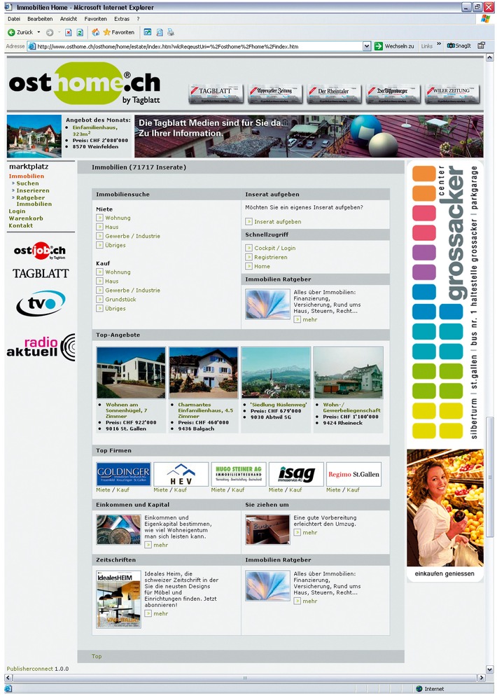 http://www.presseportal.ch/fr/story.htx?firmaid=100009970 -Avec www.osthome.ch, Publiconnect, l'entreprise de key account de Publicitas S.A. active sur le marché des rubriques a lancé avec succès la première solution de place de marché en ligne développée sur la base de la nouvelle technologie white label de Publisherconnect. Dès le 27 mars, les annonceurs peuvent profiter d'offres en ligne et online to print attractives sur www.osthome.ch, le nouveau portail immobilier du St. Galler Tagblatt. En complément à plus de 60'000 objets immobiliers présents sur le site, les acheteurs potentiels disposent également de divers rapports et services rédactionnels. Contrairement à d'autres solutions existant actuellement sur le marché des rubriques, Publisherconnect offre une indépendance maximale aux partenaires de Publiconnect en matière de branding et de définition de l'offre publicitaire presse et en ligne. Grâce à de nombreux paramètres de configuration et une gestion intégrée, l'exploitant du portail peut personnaliser sa solution dans une très large mesure et lancer de nouvelles offres rubriques cross-media de manière autonome. En tant que seule solution rubriques entièrement intégrée, la solution Publisherconnect destinée aux éditeurs est intégralement reliée aux systèmes existants de Publicitas, ce qui permet d'assurer des processus intégraux uniques en leur genre jusqu'au prépresse pour les annonces presse de même qu'une publication dite "instantanée" pour les offres en ligne. Durant ces prochains mois, Publisherconnect sera successivement élargi et complété par de nouvelles rubriques en collaboration avec les partenaires chargés de son développement, Consultas S.A. et namics S.A.. Des projets d'implémentation pour d'autres partenaires de Publiconnect ont déjà débuté et seront lancés prochainement. Contact: Publicitas AG Permalink: