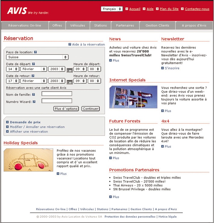 Communiqué de presseAvis Online: Réservation ultrarapide dans le monde entier2003-02-20T12:30:00Voir image: www.newsaktuell.ch/f/galerie.htx?type=ops Glattbrugg (ots) La réservation d'une voiture de location n'a encore jamais été aussi facile - ni aussi rapide: sur le nouveau site Web d'Avis (www.avis.ch) clientes et clients peuvent réserver le véhicule souhaité en quatre étapes simplissimes. L'ensemble du processus de réservation - du choix de la station, du véhicule et de la date à la confirmation, en passant par l'offre de prix - ne dure pas plus de 90 secondes; une simple demande de prix tout juste 30 secondes. Les coûts de la location avec assurances et taxes sont calculés en ligne au franc près. Bien entendu, il est également possible de réserver en ligne des équipements supplémentaires tels que des sièges pour enfants, des porte-skis, etc.. Avis est le seul loueur de voitures au monde à permettre la réservation d'un véhicule par Internet jusqu'à quatre heures avant sa prise en charge - sans carte de crédit. C'est également le seul à proposer des voitures aux émissions neutres en CO2 grâce au soutien du programme "Future Forests". Avec plus de 5'000 stations réparties dans plus de 170 pays, Avis est l'une des grandes agences de location de voitures au monde. L'entreprise souhaite encore consolider ses positions en offrant des prestations orientées vers le client - comme son nouveau site Web encore plus convivial. Tout à fait selon la devise Avis "We try harder". Contact: Avis Autovermietung AG Permalink: