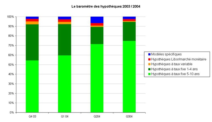 Communiqué de presseLes hypothèques à taux fixe inspirent toujours confiance: Le Baromètre des Hypothèques de Comparis du troisième trimestre 20042004-10-12T12:24:00Zurich (ots) - Voir graphic: www.newsaktuell.ch/f/galerie.htx?type=ogs Les hypothèques à taux fixe sont toujours très appréciées. Elles représentent 95 % des demandes d'hypothèques au troisième trimestre 2004. C'est la proportion la plus élevée depuis les premières mesures effectuées par comparis.ch en janvier 2003. Vers la fin du trimestre, une incertitude quant à une hausse rapide des taux d'intérêt s'est fait sentir. La demande s'est alors reportée sur des hypothèques à taux fixe de plus courte durée. Au cours du troisième trimestre 2004, la demande d'hypothèques à taux fixe à long et à court terme s'est stabilisée à un niveau élevé par rapport au trimestre précédent. La confiance des emprunteurs dans cette forme de financement demeure: 95 % des candidats au crédit souhaitent une hypothèque à taux fixe. Depuis le début des analyses du service comparatif sur internet, comparis.ch, en janvier 2003, il s'agit là du niveau le plus élevé. Le Baromètre des Hypothèques de Comparis (cf. graphique) révèle les anticipations des emprunteurs au cours du trimestre. Il met en évidence les durées et les types d'hypothèques qui intéressent les candidats au crédit. Les hypothèques à taux variable, celles indexées sur le Libor ou le marché monétaire, attirent de moins en moins. Leur part s'est constamment réduite au cours des douze derniers mois et pour atteindre à peine 3 % au troisième trimestre 2004. La demande pour les modèles spécifiques est également en baisse. Pour les hypothèques à taux fixe, ce sont surtout les durées à long terme qui sont recherchées, à savoir entre 5 et 10 ans. En tête des demandes, d'après les statistiques de comparis.ch, se trouvent les hypothèques à taux fixe sur 5 ans. Les durées excédant 5 ans sont nettement moins demandées. C'est comme si les emprunteurs potentiels reculaient devant les engagements à trop long terme en dépit du niveau relativement intéressant des taux. Une des explications de cette réserve pourrait certainement être le fait que plus la durée d'une hypothèque est longue, plus il est difficile de la renégocier prématurément. De plus, le taux d'une hypothèque à taux fixe sur 10 ans est d'environ 0.7 point supérieur à celui d'une hypothèque identique sur 5 ans. La hausse des taux attendue depuis des mois ne s'est encore que partiellement manifestée. L'intérêt légèrement plus marqué pour les hypothèques à taux fixe et à court terme (durées de 1 à 4 ans) surtout sur la fin du trimestre montre que parmi les candidats au crédit l'unanimité n'est pas de mise et que l'incertitude règne quant à la prochaine hausse des taux. Nous saurons au cours des prochains mois si cette évolution n'est qu'un phénomène temporaire ou pas. Données provenant de la Bourse aux Hypothèques de comparis.ch Le Baromètre des Hypothèques est une statistique fondée sur les demandes d'hypothèques déposées sur la Bourse aux Hypothèques de comparis.ch. Depuis novembre 2002, la Bourse aux Hypothèques donne aux personnes intéressées la possibilité de déposer leur demande de financement en ligne auprès d'environ 30 banques et assurances. Elle représente un outil permettant de chercher une hypothèque à ses mesures de façon simple et rapide. Le prochain Baromètre des Hypothèques paraîtra début janvier 2005. Contact: Martin Scherrer Permalink: