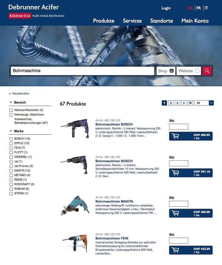 Communiqué de presseDebrunner Acifer au Top 5 du Swiss E-Commerce-Award (IMAGE)2014-05-13T10:00:10St-Gall (ots) - La plate-forme e-business de Debrunner Koenig a le vent en poupe. Le magasin en ligne de Debrunner Acifer s'est classé au top 5 du Swiss E-Commerce-Award. Peu avant, le nouveau site Web avait remporté le bronze dans la catégorie Business de la «Best of Swiss Web Award Night». Armin Lutz, responsable du projet, se félicite: «Nous sommes extrêmement heureux de voir notre nouvelle solution Web B2B nominée pour un deuxième award». Le magasin en ligne B2B de l'entreprise st-galloise s'inscrit bien dans l'air du temps et a convaincu les 12 membres du jury aussi bien par ses qualités techniques que visuelles. Cette année, 135 candidats concouraient au Swiss E-Commerce Award initié par l'entreprise de conseil zurichoise Carpathia Consulting. Recherche de produits facilitée grâce au filtre à facettes La puissante fonction de recherche de produits avec filtres à facettes forme le pivot du magasin en ligne B2B de Debrunner Acifer. L'offre contient plus de 160'000 articles. Le nouveau magasin en ligne B2B est accessible sur: www.d-a.ch. L'e-shop est également disponible sous forme d'app pour smartphones. La conception et la réalisation de la plate-forme e-business ainsi que le design du magasin en ligne B2B ont été confiés à Namics. L'implémentation a quant à elle été assurée par FO-Zürisee/TI2000. Contact: Debrunner Koenig Management AG Permalink: