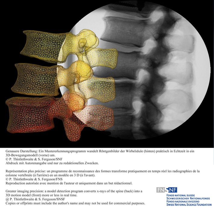 http://www.presseportal.ch/fr/pm/100002863 -Images 3D de la colonne vertébrale Grâce à une nouvelle méthode développée dans le cadre du Programme national de recherche «Santé musculo-squelettique - douleurs chroniques» (PRN 53), les chercheurs peuvent représenter les mouvements de la colonne vertébrale en trois dimensions. Ils espèrent ainsi faciliter le développement de nouvelles prothèses de disques intervertébraux. Les douleurs lombaires font partie des problèmes médicaux les plus fréquents dans notre société. Ces douleurs apparaissent souvent lors de positions «instables» de la colonne vertébrale: si un patient se penche, se tourne ou se tend, les différentes vertèbres ne bougent pas normalement et appuient ainsi sur les branches nerveuses qui proviennent de la moelle épinière. Jusqu'à présent les médecins étudiaient les mouvements de la colonne vertébrale au moyen de radiographies dont la représentation se limitait à deux dimensions. Une équipe dirigée par Stephen Ferguson, de l'Institut de technologies chirurgicales et de biomécanique de l'Université de Berne, a mis au point une méthode permettant de représenter les mouvements de la colonne vertébrale en trois dimensions. Le principe est le suivant: un appareil de radiographie vidéo, comme il en existe dans de nombreuses cliniques, filme la colonne vertébrale pendant que le patient exécute les mouvements indiqués. Un nouveau procédé de traitement des images unique en son genre transforme alors ces données en un modèle de mouvement en 3D. Le tout se déroule pratiquement en temps réel - et fournit des résultats que seuls des processus douloureux et rarement utilisés ont donné jusqu'à maintenant, au cours desquels des sondes sont implantées dans la colonne vertébrale, à travers la peau. L'objectif des chercheurs est de constituer une banque de données sur les mouvements de la colonne vertébrale. «Les images prises sur des gens en bonne santé et sur des patients pourraient aider à faire la distinction entre les mouvements normaux de la colonne vertébrale et les mouvements présentant une pathologie», explique Stephen Ferguson. Cette distinction, de plus, faciliterait le développement de nouveaux implants tels que des prothèses de disques intervertébraux. Cependant, la méthode doit tout d'abord faire son entrée dans la pratique. Car il faut résoudre encore un problème: pour les diagnostics concernant la colonne vertébrale, les médecins font de plus en plus souvent des clichés obtenus par résonance magnétique (IRM). Cette technique provoque certes de faibles rayonnements, mais elle représente les os de manière moins précise. Les chercheurs sont actuellement en train d'adapter leur méthode de telle sorte que les données obtenues par résonance magnétique puissent aussi être utilisées. Optimiste, Stephen Ferguson est convaincu qu'ils parviendront à rendre cette méthode encore plus intéressante pour les partenaires de l'industrie. Programme national de recherche «Santé musculo-squelettique - douleurs chroniques» (PNR 53) Pendant 5 ans, 26 équipes de recherche se sont attelées dès avril 2004 à l'étude de la santé de l'appareil locomoteur de la population suisse. Les chercheurs se sont penchés sur les causes des maladies qui l'affectent et ont soumis les traitements thérapeutiques existants à un examen critique. Ils ont aussi développé de nouvelles stratégies pour entretenir ou rééduquer l'appareil locomoteur. www.nfp53.ch Le texte et la photo (en haute résolution) peuvent être téléchargés sur la page Internet du Fonds national suisse sur: www.fns.ch > Médias > Image de la recherche Contact: PD Dr Stephen J. Ferguson Permalink: