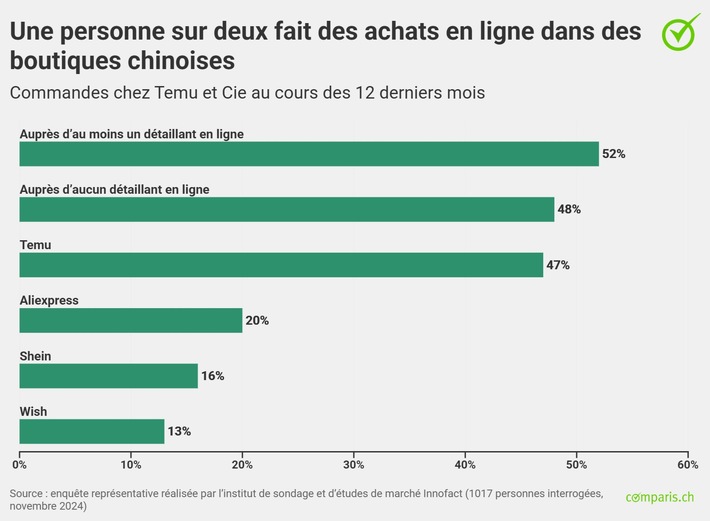 Zurich, le 28 janvier 2025 – Au cours des douze derniers mois, un adulte sur deux a commandé auprès d’au moins un des quatre détaillants en ligne chinois à bas prix Temu, Wish, Aliexpress ou Shein. C’est ce qui ressort d’une enquête représentative de comparis.ch, le comparateur en ligne. Le plus populaire est Temu ; 47 % des personnes interrogées qui ont correctement identifié Temu comme une boutique en ligne chinoise y ont effectué une commande au moins une fois en 2024. Aliexpress arrive en deuxième position avec 20 %, suivi par Shein avec 16 %. Michael Kuhn, expert Consumer Finance chez Comparis : « Le fait que 52 % des personnes interrogées aient déjà commandé dans au moins une boutique chinoise montre qu’elles sont désormais très connues et utilisées par un nombre croissant de personnes. »