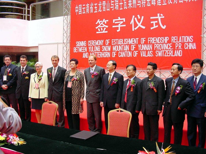 Communiqué de presseJumelage d'amitié entre le Cervin (Zermatt) et Yulong Snow Mountain (Lijiang, Chine)2001-11-13T14:42:00Zurich (ots) - Les photos ont été envoyées par Photopress via le réseau satellite de Keystone (voir image: www.photopress.ch et www.newsaktuell.ch/f/galerie.htx?type=obs) Suisse Tourisme a orchestré dans ses activités en Chine le premier jumelage entre la Yulong Snow Mountain à Lijiang et le Cervin (Matterhorn) à Zermatt. Ce jumelage est le second pour la Suisse après celui des villes de Kunming et Zurich en 1982. Il positionne le Cervin comme l'une des plus prestigieuses montagnes au monde, et ce, précisément dans la région montagneuse la plus connue en Chine, au sud de la mythique chaîne de l'Himalaya. Agissant de concert avec Valais Tourisme, Wenjia Zhang, représentante de Suisse Tourisme pour la Chine à Pékin, s'est intéressée à trouver un partenaire connu de tous les chinois, en l'occurrence la Yulong Snow Mountain cumulant à 5'596 mètres d'altitude, pour y associer l'une des montagnes les plus prestigieuses de Suisse: le Cervin (Matterhorn). Ce type de jumelage engendre un grand engouement auprès des médias chinois, dès lors intéressés à connaître l'ensemble de notre pays et de ses infrastructures. Des équipes de télévision ont d'ores et déjà prévu une visite dans notre pays. Sur le plan touristique, la Suisse se place ainsi devant ses concurrents alpins. CNTA, l'organisme officiel pour le développement du tourisme en Chine, a d'ailleurs apporté son soutien à ce jumelage. En effet, pour CNTA, la province de Yunnan, où se trouve la Yulong Snow Mountain, est une région touristique prioritaire pour la Chine. Des investissements de 100 millions de US$ sont prévus. Cette région est à juste titre surnommée "Shangri-li", en français les horizons perdus du paradis, et la vieille ville de Lijiang, située dans cette belle province, a été notamment reconnue World Heritage par l'UNESCO en 1997. D'avoir associé la Suisse par le Cervin à la Yulong Snow Mountain ne pourra que profiter à l'image de notre pays et devrait nous attirer la sympathie des millions de visiteurs chinois attendus dans cette province. Ceci permettra à Suisse Tourisme de créer de nombreux événements, auxquels seront associés la marque "Suisse, Matterhorn" et Zermatt. Une délégation importante du Valais avec Marie-Thérèse Schwery, Présidente du Parlement Valaisan, Christophe Bürgin, Vice Président de la Commune de Zermatt, Urs Zenhäusern, Directeur Valais Tourisme et Roland Imboden, Directeur de Zermatt Tourisme, a participé à la signature officielle du document avec les responsables de la province de Yunnan et notamment Monsieur le Gouverneur Shao Qiwei. Wenjia Zhang, représentante de Suisse Tourisme pour la Chine, Michel Ferla, Directeur ajoint de Suisse Tourisme, et son homologue de la China National Tourist Authority étaient également présents, de même qu'Edith Strub de Zurich Tourisme, qui tenait à réaffirmer à cette occasion les liens entre la ville de Zurich et Kunming, villes jumelées depuis 1982. Ces cérémonies se sont déroulées le 8 nkovembre 2001 en présence de l'ensemble des tour-opérateurs chinois, lors de l'ouverture du plus grand marché touristique international en Asie, le CITM. Les touristes chinois, malgré les turbulences internationales, continuent de voyager. Les nuitées chinoises en Suisse ont progressé de 15% et 100'000 nuitées sont prévues pour cette année. Contact: Daniela Gren-Bär, porte-parole de Suisse Tourisme Permalink: