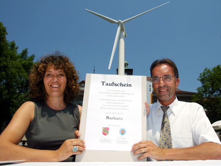 Communiqué de pressemont-Crosin: production d'énergie éolienne en hausse de 90%: la Conseillère d'Etat Egger baptise le modèle réduit d'éolienne2002-06-19T17:36:01Berne (ots) - JUVENT SA, la plus grande centrale éolienne suisse située à Mont-Crosin dans le Jura bernois, a augmenté sa production de 90%. Symbole de ce bon résultat, un modèle réduit d'éolienne d'une hauteur de sept mètres a été installé provisoirement devant le siège de l'entreprise responsable BKW FMB Energie SA à Berne. Cette éolienne vise à sensibiliser le public au courant éolien en perspective de l'ouverture du marché de l'électricité; baptisée "Barbara" par Martin Pfisterer, président de JUVENT SA et Barbara Egger, conseillère d'Etat et nouvelle Directrice de l'Energie du Canton de Berne, elle est aussi, selon cette dernière, "le symbole d'une exploitation de l'énergie éolienne qui tient compte du paysage". Avec 2,5 millions de kilowattheures, la production d'énergie éolienne indigène des cinq derniers mois a atteint un niveau record. Elle est certes modeste comparée à la production des centrales hydrauliques et nucléaires; elle correspond cependant à près de la moitié de l'énergie solaire (photovoltaïque) produite dans toute la Suisse. La centrale éolienne de Mont-Crosin constitue ainsi l'installation de production la plus importante du pays dans le domaine des nouvelles énergies renouvelables. L'augmentation de la production est due aux vents favorables et à la mise en service par BKW FMB Energie SA, en novembre dernier, de deux nouvelles éoliennes ultraperformantes d'une puissance de 850 kilowatts chacune. D'une technologie de pointe et situées à des emplacements optimaux, elles ont largement contribué à cette production exceptionnelle. L'éolienne modèle réduit sera exposée à Berne (Viktoriaplatz) durant quelques jours. Elle retrouvera ensuite sa place dans le Jura bernois, au départ du sentier découverte. Ce chemin didactique de 4 km qui relie la centrale éolienne de Mont-Crosin et la centrale solaire de Mont-Soleil a déjà été parcouru par plus de 300 000 visiteurs Inscriptions pour les visites guidées auprès de: Informations visiteurs c/o BKW FMB Energie SA, tél. 031 330 53 04, le matin. ots Originaltext BKW FMB Energie AG Internet: www.newsaktuell.ch Contact: Windkraftwerk JUVENT SA Permalink: