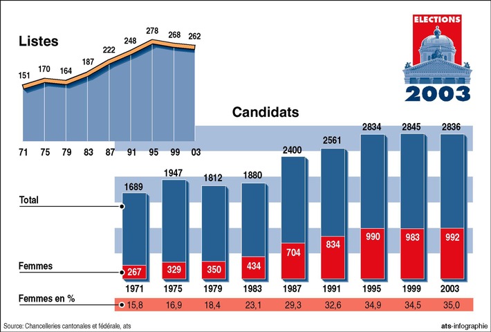 Communiqué de presseElections: Une comparaison des Listes et Candidats de 1971 à 20032003-09-22T15:20:31Berne (ots) - L'infographie de l'ats peut être visualisée en couleurs sous: www.newsaktuell.ch/f/galerie.htx?type=ogs Une comparaison des listes et Candidats de 1971 à 2003. Notice: La reproduction du graphique est soumise à des honoraires. Contact: ats-infographie Permalink: