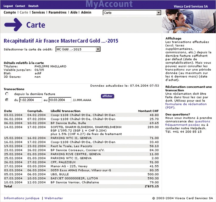 Communiqué de presseViseca Card Services SA: Contrôlez vos dépenses en ligne à tout moment2004-04-21T10:30:00Glattbrugg (ots) - Voir images: www.newsaktuell.ch/f/story.htx?nr=100473952 Depuis juillet 2003, Viseca Card Services SA propose à sa clientèle privée une nouvelle prestation gratuite en ligne: MyAccount. Celle-ci offre à tout moment et en tout lieu une vue d'ensemble sur les dépenses effectuées par carte de crédit ainsi qu'une transparence maximale en matière de taux de conversion et de frais de traitement. Vous pouvez ouvrir un compte MyAccount en toute simplicité et sans frais au moyen de toute carte de crédit Viseca valable (carte principale ou carte supplémentaire). D'autres cartes de crédit autorisées peuvent ensuite être rattachées à votre compte. Après vous être identifié en toute sécurité, vous accédez très facilement, par l'intermédiaire de "MyAccount", à votre compte personnel de carte de crédit sur Internet. Vous pourrez y consulter toutes les informations actuelles concernant votre carte de crédit. A tout moment, sans aucuns frais et depuis n'importe quel endroit au monde. Possibilités d'achats en ligne en toute sécurité MyAccount constitue par ailleurs le point de départ de l'utilisation des nouvelles méthodes de paiement pratiques "Verified by VISA" et "MasterCard SecureCode". Avec ces dernières, VISA et MasterCard ont introduit un nouveau standard de sécurité international pour les achats sur Internet qui rend les paiements en ligne par carte de crédit encore plus sûrs, le tout sans installation de logiciels ni téléchargement de programmes sur votre PC et sans frais supplémentaires. Dans les boutiques Internet ayant adopté ce système de sécurité, l'utilisateur doit, en sus de son numéro de carte, également saisir un mot de passe. Le paiement sur Internet par l'intermédiaire de ce nouveau système est ainsi comparable à un règlement d'achat avec une signature dans un magasin. Viseca Card Services SA est une société créée conjointement par les banques cantonales, les Banques Raiffeisen, les banques RBA, la BANQUE MIGROS et la banque Coop ainsi que par différentes banques commerciales et privées. Grâce à un réseau étendu, Viseca couvre plus de 70% de l'ensemble des guichets de banque et tous les bureaux de poste. Avec la VISA Card, la MasterCard et le programme de primes webmiles, Viseca se met au service de marques de renom. Depuis sa création en l'an 2000, Viseca est devenue le deuxième plus grand émetteur de cartes de crédit avec plus de 900'000 client(e)s. MyAccount fournit les informations ci-après en ligne: - soldes actuels de toutes les cartes de crédit rattachées