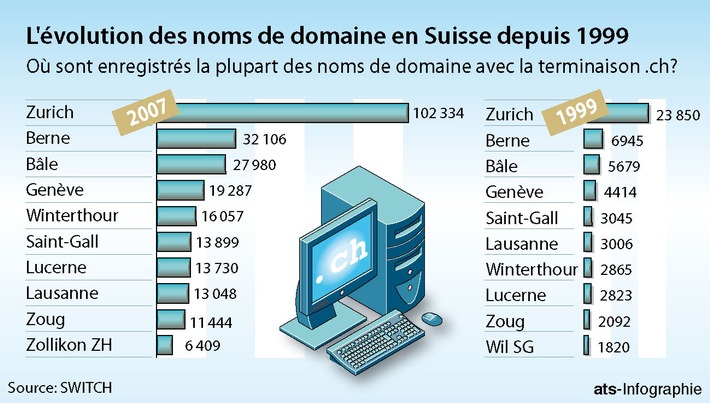 sous: http://www.presseportal.ch/fr/pm/100004516 -SWITCH offre désormais une représentation visuelle des noms de domaine sur une carte de Suisse interactive. La carte montre la répartition des noms de domaine avec l'extension .ch. Une demande spécifique est possible par commune. La carte de Suisse est accessible au public sur www.switch.ch. En Suisse, un habitant sur dix détient un nom de domaine avec l'extension .ch. On constate des différences régionales considérables tant en chiffres absolus que par rapport à la population. Nombre de noms de domaine enregistrés: Zurich est en tête depuis 1999, devant Berne et Bâle. Visualisation des noms de domaine SWITCH propose pour la première fois un outil de demande à base Internet sur les noms de domaine en Suisse. L'évaluation rassemble tous les noms de domaine au niveau de la commune. C'est d'ailleurs aussi la base de calcul pour les villes. Cliquez sur une commune et apprenez des choses intéressantes sur le nombre et la densité des domaines. Ou bien lancez une recherche individuelle. La carte de Suisse interactive ainsi qu'un film sont accessibles au public sur www.switch.ch. La Fondation SWITCH exploite depuis 1987 le réseau scientifique suisse qui garantit aux hautes écoles l'accès à la société de l'information. Ce réseau ultraperformant met en lien des utilisateurs en Suisse et dans le monde entier. L'exploitation de ce réseau fournit à SWITCH un savoir-faire indispensable et représente la base technologique pour l'exploitation du service d'enregistrement des noms de domaine avec l'extension .ch et .li. Contact: SWITCH Permalink: