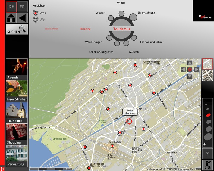 http://www.presseportal.ch/fr/pm/100015258 -L'agence multimédia hof3 a réalisé, en collaboration avec omnitron Engineering & Software, une stèle interactive pour piétons, à l'intention de la ville de Bienne. Ces informations peuvent être consultées sur 22 stèles ultramodernes, équipées d'écrans tactiles. Outre un plan de ville, de nombreuses informations sont mises à la disposition de l'utilisateur. Très pratique, la fonction itinéraire intégrée permet l'affichage du chemin le plus court vers la destination souhaitée. A partir de demain, dans la ville de Bienne, des citations de grands personnages sur le thème de la communication interpellent les passants, en lettres lumineuses. 22 stèles d'information interactives, équipées d'écrans tactiles, enrichissent la physionomie de la ville. Elles permettent de consulter non seulement des plans de ville numériques mais aussi de nombreuses informations concernant Bienne et ses environs. Conformément au slogan «Bienne, ville de la communication», l'ensemble des contenus est proposé en langues allemande et française. L'utilisateur peut choisir entre deux types de plans de ville: une représentation de type «carte routière» ou bien une orthophoto. La position de l'utilisateur est indiquée vue du ciel. Il est même possible de zoomer sur des détails de la carte. Des informations spécifiques sur le tourisme, la gastronomie, ainsi qu'un guide des commerces et des services administratifs peuvent être consultés d'un effleurement du doigt. Un agenda renseigne, en outre, sur les diverses manifestations. Un système de navigation inédit permet d'affiner la recherche de manière ludique. La localisation géographique des réponses est particulièrement utile: l'itinéraire jusqu'au lieu de destination est immédiatement indiqué sur la carte numérique. Ce système d'information est particulièrement facile d'emploi. Une fonction supplémentaire s'adresse aux personnes handicapées: en tapant du doigt sur le symbole «handicapés», la navigation est modifiée et adaptée aux besoins spécifiques. Cette stèle interactive pour piétons, unique en Suisse, sera présentée au public le 12 juin 2009, à 14 heures, sur la place centrale de la ville de Bienne. Indication pour les rédactions Des informations supplémentaires figurent sous: www.keryx.ch , www.hof3.com , www.omnitron.ch Contact: hof3 GmbH Permalink: