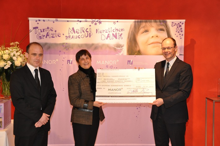 http://www.presseportal.ch/fr/pm/100001185 -Bertrand Jungo, directeur général de Manor SA, a remis aujourd'hui, 25 janvier 2010, un chèque d'un montant de 250'000 francs à la Fondation Suisse pour la Protection de l'Enfant (FSPE). Cette somme provient de la vente de diffuseurs de fragrances décoratifs dans le cadre de la traditionnelle action Charity. Pour la neuvième année consécutive, Manor organise une récolte de dons durant la période de l'Avent en faveur d'organisations de bienfaisance en Suisse. L'action Charity 2009 au profit de la Fondation Suisse pour la Protection de l'Enfant (FSPE) a remporté un vif succès. « Cette année encore, nos clients ont soutenu cette action caritative au delà de nos espérances. Nous tenons à les en remercier chaleureusement», a déclaré Bertrand Jungo, CEO de Manor SA lors de la remise du chèque de 250'000 francs à la vice-présidente de la FSPE, Madame Andrea Burgener Woeffray. La cérémonie s'est déroulée au sein de Manor Bâle en présence de la délégation de la FSPE. Manor poursuit sa longue tradition caritative. La plus grande chaîne suisse de grands magasins accorde une grande importance à l'engagement social et caritatif : celui-ci fait partie de ses principes d'entreprise citoyenne. L'action Charity de Manor connaît chaque année un large succès grâce au soutien de sa clientèle, de ses collaborateurs et des médias. Depuis la création de cette opération de bienfaisance en 2001, de nombreuses organisations d'utilité publique, dont Pro Juventute (action 2007) et Procap (action 2008) ont ainsi pu être soutenues financièrement. La FSPE se mobilise au niveau national, afin de combattre toute forme de violence contre les enfants, et d'ainsi faire respecter leurs droits et leur intégrité. Qu'il s'agisse de sensibiliser le grand public par le biais de campagne ou de projet, de proposer des formations, ou même de faire pression au niveau politique, tout est mis en oeuvre pour assurer le bien-être des enfants par le biais d'un travail de prévention. Le matériel photographique est disponible à l'adresse suivante : www.media.manor-communication.ch > Information > Charity 2009 Contact: Manor SA Permalink: