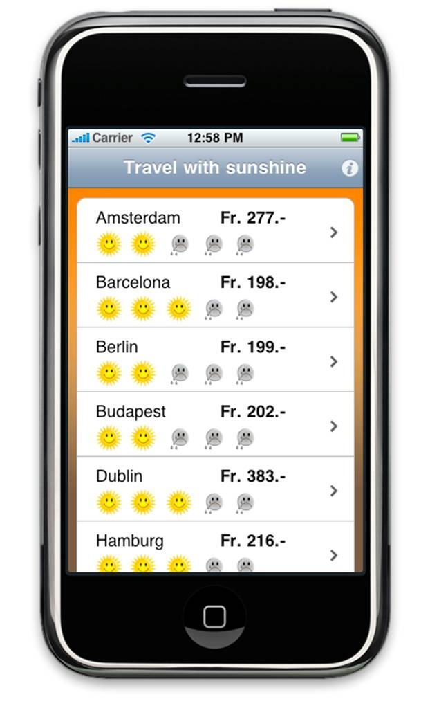 http://www.presseportal.ch/fr/pm/100018669 -21degrees SA, http://www.21degrees.com, société de management du risque climatique, basée à Genève, lance ce lundi 7 juin sur l'Apps Store la version 1.0 de TRAVEL SUNSHINE[TM] en Search ou TRIP SUNSHINE [TM] en dekstop, une apps (diminutif pour application) qui permet de mixer la probabilité de la pluie la plus faible pour votre prochain week-end, avec le meilleur prix pour s'y rendre (vols+hôtels). Prix, Prévisions, Pluviométrie : les 3Ps Ainsi, le but n'est pas de partir en week-end bon marché exclusivement, mais également de s'assurer en last minute, des meilleurs prix et de la meilleure météo, pour avoir un week-end Sunshine ET bon marché, explique les créateurs. La règle des 3P ainsi voit le jour Prix, Prévisions et Pluviométrie au coeur de cette application iPhone. L'appication mixe en effet les prévisions météorologiques avec les dernières technologiques, et ceci jusqu'à 15 jours de données climatiques analysées. Ainsi, TRAVEL SUNSHINE 1.0 calcule les indices de beau temps, ciel dégagé, de nébulosité, de couverture nuageuse, de pluviométrie, pour offrir sous forme de pictogrammes une parfaite lisibilité. L'application va également interroger les sites de voyages des produits Last Minute afin de trouver les meilleures offres pour partir en week-end ou en City Trip en Europe, au départ de la Suisse, Genève, Bâle ou Zürich pour la version 1.0. "Ainsi, les sites des voyagistes sont rajoutés au fur et à mesure des demandes reçues" souligne Stéphane Perino, fondateur et directeur de 21degrees SA. L'avantage? "Nous ne prenons aucune commission sur les ventes avec nos partenaires, seule l'application est payante, le modèle économique est ainsi totalement transparent et éthique, après c'est au voyagiste d'effectuer sa vente avec son site web ou mobile." Pour télécharger l'application (payante CHF 2.20.-), connectez-vous sur l'App Store et tapez "Travel Sunshine" dès ce lundi 7 juin. La version 1.1 est déjà en développement pour ce mois de Juin. A propos de 21 degrees SA21 degrees SA, société de gestion du risque climatique, basée à Genève, offre des prévisions climatiques à court, moyen et long terme pour anticiper les amplitudes thermiques et changements météos brusques qui impactent chaque entreprise et le niveau de demandes des produits, afin de vendre des produits en adéquation avec la météo réelle. 21degrees SA propose des prévisions heure par heure de la journée, des prochains 15 jours exclusifs en Suisse par exemple, et les prévisions saisonnières pour 6 mois pour les entreprises. 21degrees SA a comme références des clients tels que Leysin Tourisme, Rampini, LeShop... Contact: 21 degrees SA Permalink: