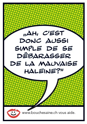 La campagne de Santé buccale en Suisse démontre avec des affiches et des annonces qu'il est important d'aborder activement le problème. Des brochures d'information ainsi que des échantillons (solution bucco-dentaire, râpes linguales) sont disponibles dans les cabinets dentaires, chez les médecins de famille, dans les pharmacies, les drogueries et dans de nombreuses filiales de Coop. La campagne dure du 6 au 17 septembre 2010. Le site de l'action (www.bouchesaine.ch) propose aux personnes directement affectées et à leurs proches une possibilité de s'informer anonymement sur le problème de la mauvaise haleine et un forum où un expert répondra aux questions sur l'halitose. L'action « Santé buccale en Suisse » est menée par un collectif d'intérêt formé par la Société suisse d'odonto-stomatologie SSO, Swiss Dental Hygienists et le service de recherche elmex® (GABA International SA). L'action 2010 est soutenue par la Caisse pour médecin-dentistes SA, les Fonds de la loterie des cantons d'Argovie, Soleure et Zoug, Trisa, les associations des pharmacies et drogueries ainsi que Coop Suisse. Contact: Felix Adank, service de presse et d'information SSO Permalink: