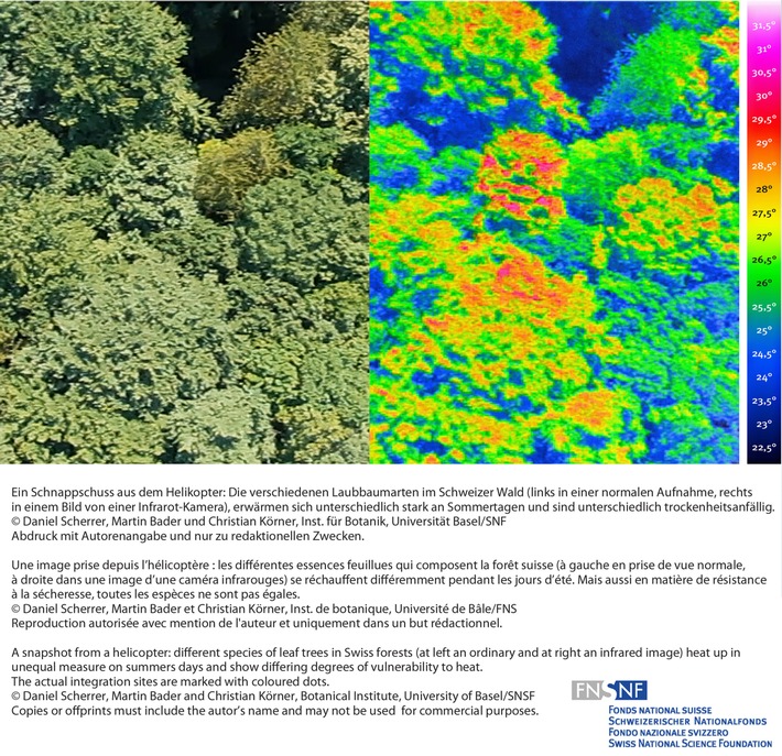 Communiqué de presseFNS : Image de la recherche mars 2011 : Comment les arbres feuillus autochtones réagissent-ils au réchauffement et à la sécheresse croissante de notre climat?2011-03-16T09:30:00Bern (ots) - L'avenir appartient aux chênes et aux frênes Si le climat se réchauffe à l'avenir, il faut s'attendre à de plus longues périodes de sécheresse, qui vont éprouver différemment les diverses essences feuillues de Suisse. L'érable sycomore et le tilleul à grandes feuilles sont les espèces qui souffrent le plus de la pénurie d'eau, le frêne et le chêne rouvre celles qui la supportent le mieux. C'est ce que viennent de démontrer des chercheurs de l'Université de Bâle. La Suisse doit s'attendre à un réchauffement de son climat, mais aussi à une augmentation des longues périodes sèches pendant l'été. Comment les différentes essences qui composent les forêts helvétiques supportent-elles ce phénomène ? Un classement des arbres feuillus en fonction de leur sensibilité à la sécheresse permettrait-il de déduire des recommandations forestières, afin de préparer la forêt à l'avenir ? En hélicoptère Un groupe de chercheurs, emmené par Christian Körner de l'Institut de botanique de l'Université de Bâle, s'est penché sur ces questions dans le cadre d'un essai de grande envergure. Avec le soutien du Pôle de recherche national « Climat » et le Programme « Forêt et changement climatique » de l'Office fédéral de l'environnement, les chercheurs n'ont pas lésiné sur les moyens. Ils ont enterré en forêt des senseurs d'humidité dans des sols pierreux, sur quatre sites des environs de Bâle présentant des différences en matière d'humidité. Ils ont aussi fixé des senseurs aux arbres, afin de mesurer l'intensité du flux d'eau qui remonte des racines à la cime, où l'eau s'évapore par les pores des feuilles. Là-haut, d'autres senseurs flottants amarrés à des ballons ont mesuré la température et l'humidité de l'air au sein du feuillage. Enfin, lorsqu'il faisait particulièrement beau, les chercheurs s'embarquaient à bord d'un hélicoptère, afin d'effectuer des prises de vue à la caméra à infrarouge de leurs parcelles de forêt, dans le but de mesurer la température de chaque cime d'arbre. Restreindre l'évaporation Les cimes aérées ont davantage tendance à évacuer la chaleur excédentaire que les feuillages denses d'un tilleul à grandes feuilles ou d'un érable sycomore. Par ailleurs, l'évaporation joue un rôle décisif dans le réchauffement des cimes d'arbres. « Lorsque vous tenez en l'air votre doigt mouillé, vous sentez nettement qu'il se refroidit, explique Christian Körner. De la même manière, les cimes d'arbres ne se réchauffent pas tant qu'elles sont bien alimentées en eau et que l'évaporation est importante. » Lorsque les arbres viennent à manquer d'eau, les pores de leurs feuilles se referment. Ils restreignent ainsi leur évaporation, mais aussi leur croissance. Classement de la résistance à la sécheresse Mais certains arbres se montrent économes et resserrent les pores de leurs feuilles même s'ils ont suffisamment d'eau à disposition. C'est le cas du chêne rouvre et aussi, étonnamment, du frêne. Ces deux espèces maintiennent ainsi leur alimentation hydrique à niveau pendant les périodes sèches. Voilà pourquoi on les retrouve en tête du classement de la tolérance à la sécheresse des principales essences feuillues autochtones de Suisse. Le hêtre commun et le merisier y sont un peu plus sensibles et occupent le milieu du classement, alors que l'érable sycomore et le tilleul à grandes feuilles commencent déjà au bout de quelques jours sans précipitation à réduire leur taux d'évaporation. « Selon nos résultats, les chênes rouvres et les frênes sont un bon choix pour des sites secs, si l'on veut que la forêt suisse puisse affronter un avenir qui sera plus chaud et moins riche en précipitations », conclut Christian Körner. Ces données doivent encore être comparées avec les expériences de pratique forestière faites dans des régions plus grandes. Le texte et la photo (en haute résolution) peuvent être téléchargés sur le site Internet du Fonds national suisse sur : www.fns.ch > Médias > Image de la recherche Kontakt: Prof. Christian Körner Permalink: