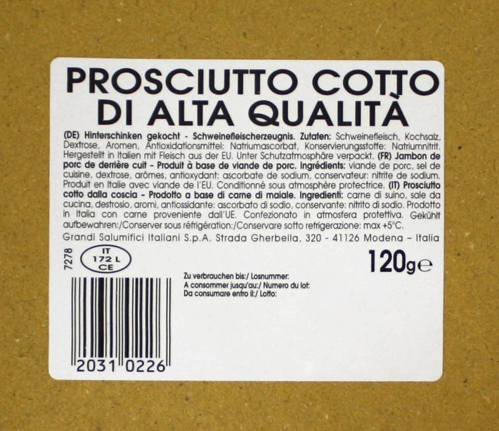 Le fabricant italien de saucisses de marque Grandi Salumifici Italiani S.p.A, situé à Modène (Italie), opère actuellement un rappel d'un des ses propres produits le "Prosciutto Cotto di Alta Qualità" (jambon cuit italien, en tranches), 120g (date de consommation: 20.08.2011, numéro de lot: 2129028, IT 172 L CE). La présence de Listeria monocytogenes a été détecté dans le produit.