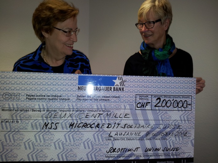 L'Union Suisse du Soroptimist International - la plus grande organisation mondiale de femmes actives professionnellement - a récolté, par de nombreuses actions menées depuis 2010, la somme de CHF 300'000. Un chèque de CHF 200'000 a été remis dernièrement à Madame Yvette Jaggi, présidente de la Fondation Microcrédit Solidaire Suisse. Le montant restant de CHF 100'000 sera remis ultérieurement.
