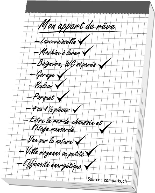 Si les locataires suisses pouvaient choisir un appartement correspon-dant à leurs souhaits, il ressemblerait à ceci : 4 à 4 ½ pièces, balcon, dans une ville de taille moyenne ou petite, entre le rez-de-chaussée et l'étage mansardé. Ce logement disposerait aussi bien d'un lave-vaisselle que d'une machine à laver, et également d'une baignoire ainsi que d'un WC séparé. Il y aurait un garage et vue sur la nature. Le sol serait recouvert de parquet, et le bâtiment en lui-même serait écologique.