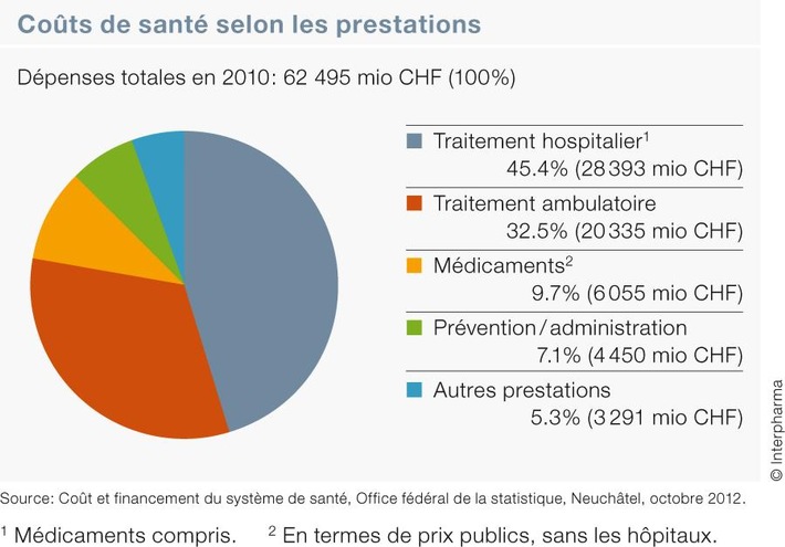 Communiqué de presse«Santé publique en Suisse»: La part des médicaments aux coûts de santé diminue à nouveau2013-02-04T14:55:02Bâle (ots) - Avec un plus de 2.5% par rapport à l'année précédente, les coûts de santé ont moins fortement augmenté en 2010 que par le passé. Ils se sont montés au total à 62.5 milliards de francs. Avec 9.7% des coûts de santé, la part des médicaments a continué à diminuer (2009: 10.1%). Des baisses de prix de l'industrie pharmaceutique ont fait nettement baisser l'indice des prix des médicaments. Ce sont les dépenses pour les traitements ambulatoires (32.5%) et hospitaliers (45.4%) qui représentent la plus grande part des coûts de santé. Par rapport à 2009, ces coûts ont augmenté respectivement de 6% et de 2.2%. Les dépenses pour les médicaments ont en revanche baissé de 2%. Augmentation du nombre de cancers Derrière les maladies cardio-vasculaires, le cancer est au deuxième rang des causes de décès en Suisse. Environ un décès sur quatre est dû à un cancer. Entre 1980 et 2010, le nombre de décès dus à ces pathologies a augmenté de plus de 18%, passant de 14 231 à 16 833. Un homme sur trois et une femme sur quatre seront confrontés à un diagnostic de cancer avant d'avoir atteint l'âge de 75 ans. Comme dans les années précédentes, la majeure partie des décès dus au cancer a été provoquée par les tumeurs malignes de l'appareil digestif, suivies des tumeurs de l'appareil respiratoire, ainsi que du cancer du sein et des tumeurs des organes génitaux féminins. Dans le cas du cancer, la prévention, un diagnostic précoce et l'accès à un traitement moderne, par exemple par anticorps, jouent un rôle essentiel. C'est dans les pays où les personnes atteintes de cancer ont un accès rapide aux médicaments novateurs que leurs chances de survie sont les plus grandes. Malgré une bonne position de la Suisse en comparaison européenne, l'évolution est préoccupante: depuis quelques années, les autorisations de mise sur le marché de médicaments et également le remboursement sont souvent retardés, en particulier pour les médicaments novateurs. Vous trouverez plus d'informations ainsi que les graphiques de la publication «Santé publique en Suisse 2013» sur le site Internet d'Interpharma www.interpharma.ch. La brochure est en outre disponible gratuitement sur papier ou sur CD-ROM. Contact: Thomas B. Cueni Permalink: