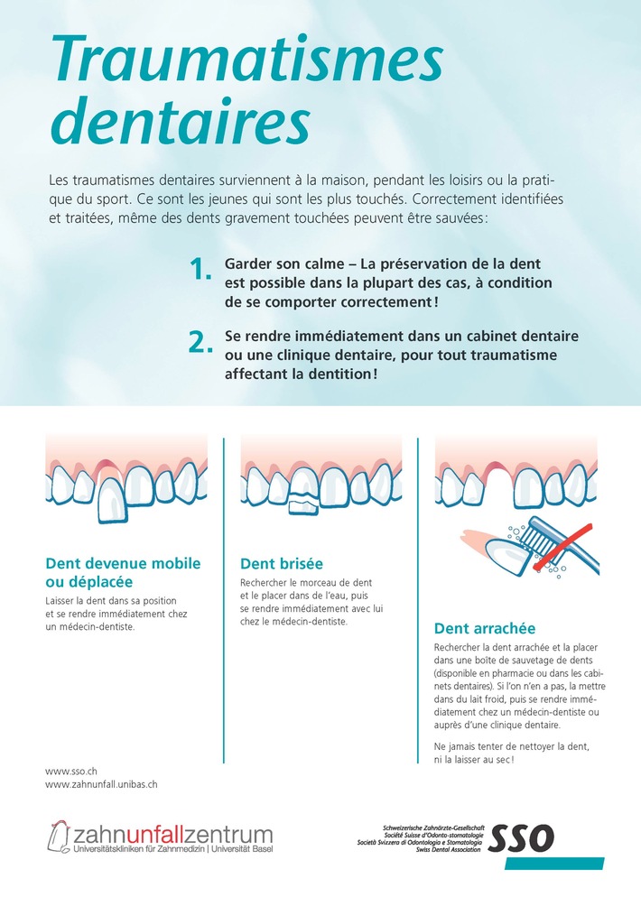 Communiqué de presseAccident dentaire à la piscine: que faire? (IMAGE)2013-05-03T14:00:21Berne (ots) - La plupart des piscines de plein-air vont ouvrir ce mois-ci. Un accident est vite arrivé en plongeant, en jouant, en sautant à l'eau: un coup, une chute, et une dent peut être déplacée, se fracturer, voire même être arrachée. La plupart des dents accidentées peuvent être sauvées, à condition que le personnel et les personnes concernées réagissent correctement. Près de la moitié des enfants et adolescents sont victimes d'un accident dentaire à un moment ou à un autre. Il importe alors d'agir rapidement. En effet, les conséquences d'un accident dentaire peuvent se répercuter jusqu'à l'âge adulte. La plupart des dents peuvent être sauvées à condition de réagir correctement. Lors d'un accident, une dent peut se déplacer, se fracturer, voire même être complétement arrachée. Les dents mobiles ou déplacées ne doivent pas être manipulées, sauf par un médecin-dentiste. Les fragments de dents fracturées ou les dents arrachées doivent absolument être apportés au médecin-dentiste. Celui-ci pourra souvent recoller les dents fracturées ou réimplanter les dents arrachées dans le maxillaire ou la mandibule. Les dents arrachées accidentellement doivent toujours être saisies par la couronne, jamais par la racine. Même si elles sont souillées, il ne faut en aucun cas les nettoyer. Prendre contact avec un médecin-dentiste Il faut immédiatement se mettre en rapport avec un médecin-dentiste après un accident dentaire. La dent pourra d'autant mieux être sauvée que l'on s'y sera rendu rapidement. Si l'on ne peut atteindre son médecin-dentiste habituel, les sections cantonales de la SSO disposent d'un service des urgences bien organisé dans toutes les régions de la Suisse. Les numéros de téléphone de ces services sont disponibles à l'adresse www.sso.ch à la rubrique «Urgences». Un fragment d'une dent fracturée peut être conservé et transporté dans de l'eau froide. Des précautions particulières s'imposent si la dent est complètement arrachée: La dent aura les meilleures chances de survie si elle est placée dans une boîte de sauvetage (disponible en pharmacie). Une solution nutritive spéciale permet de conserver les dents arrachées pendant plusieurs heures. Si l'on ne dispose pas d'une boîte de sauvetage, la dent pourra être placée dans du lait froid pour être ainsi apportée au médecin-dentiste. Informations à l'intention des maîtres-nageurs et du personnel Les suites les plus dommageables des accidents dentaires peuvent être évitées à condition que le personnel des piscines soit bien formé et qu'il agisse correctement lorsque survient un accident. Les établissements balnéaires et les piscines peuvent se procurer gratuitement auprès de la SSO des brochures d'information et des affiches. De plus, la SSO recommande à tous les établissements de tenir prêtes des boîtes de sauvetage et d'apposer bien en évidence le numéro de téléphone du service des urgences médico-dentaires de la SSO. Contact: Felix Adank Permalink: